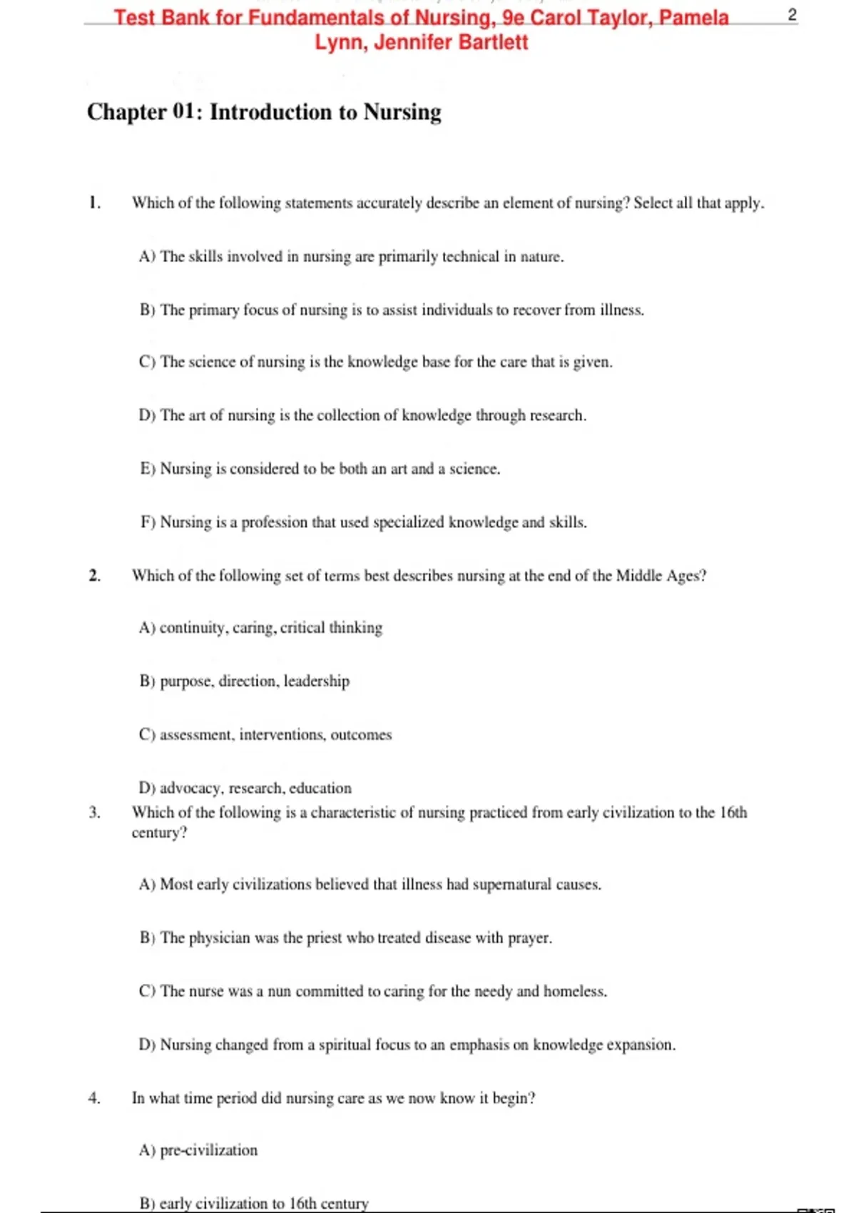 Test Bank for Fundamentals of Nursing, 9e Carol Taylor, Pamela 2