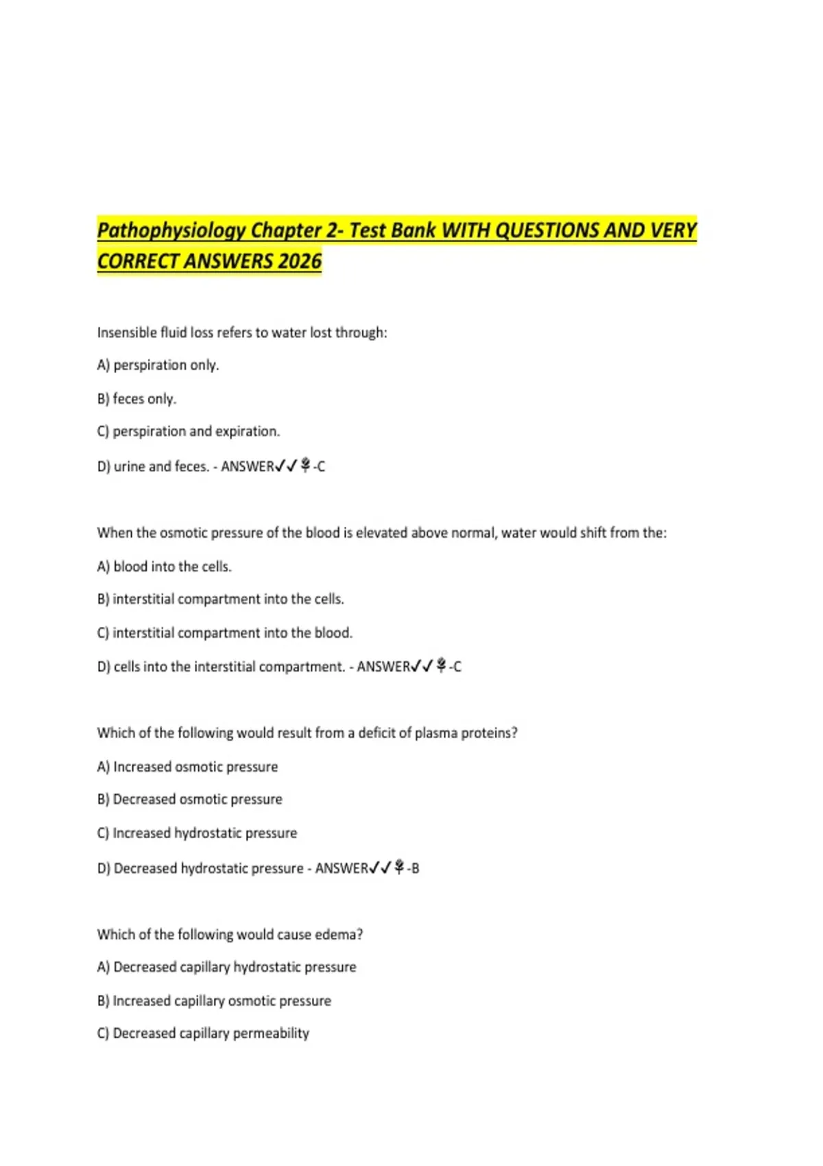 Pathophysiology Chapter 2- Test Bank WITH QUESTIONS AND VERY CORRECT ANSWERS 2026 Insensible fluid loss refers to water lost through: A) perspiration only. B) feces only. C) perspiration and expiration. D) urine and feces. - ANSWER-C When the osmotic pressur