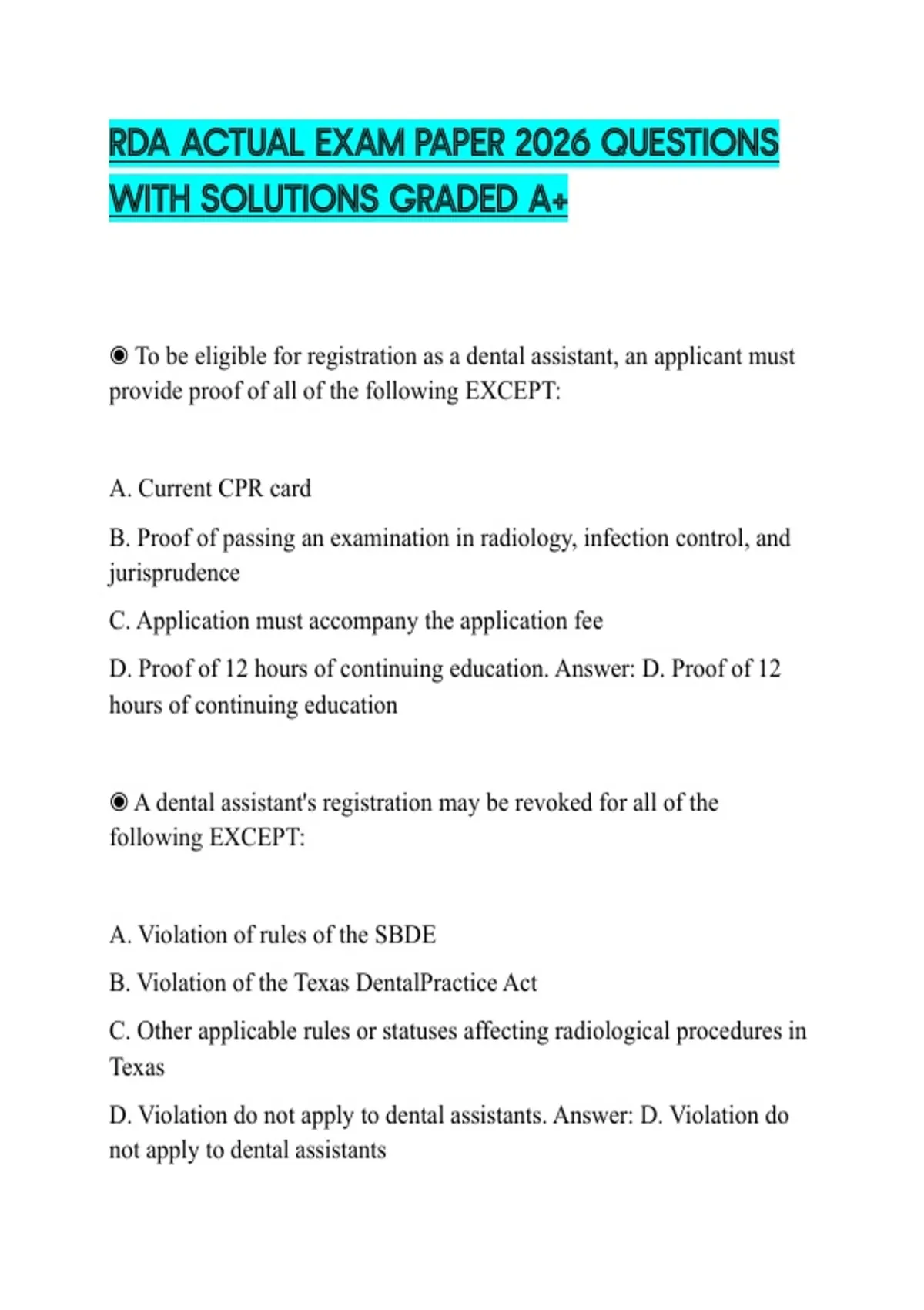 RDA ACTUAL EXAM PAPER 2026 QUESTIONS WITH SOLUTIONS GRADED A+