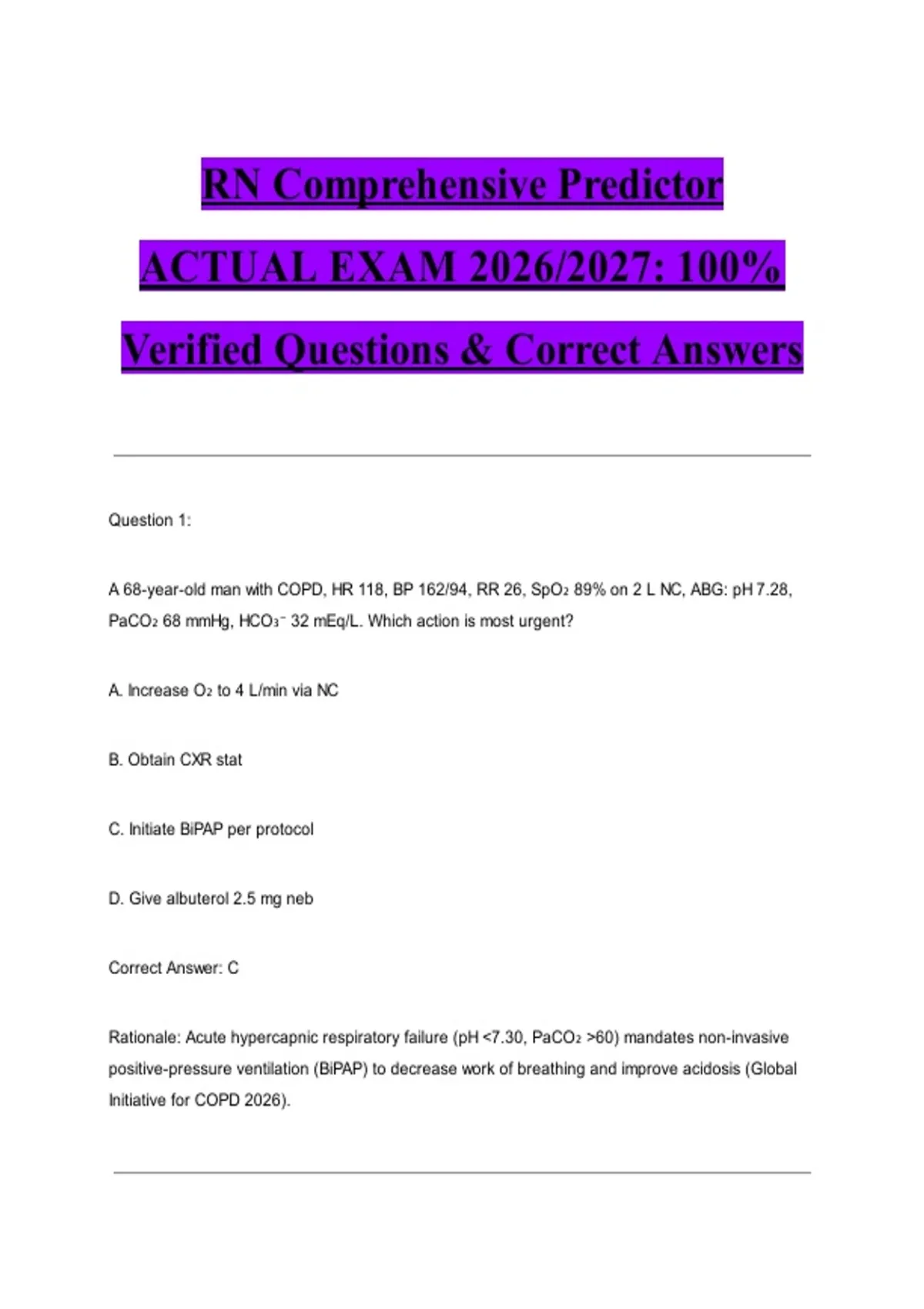 Ace your RN Comprehensive Predictor (or ATI/Kaplan equivalent) exam with this definitive 2026/2027 guide. It features the actual exam with 100% verified questions and correct answers, covering all NCLEX-RN client needs categories to accurately predict your readiness and passing probability. Your key to identifying strengths/weaknesses and achieving a top predictor score.