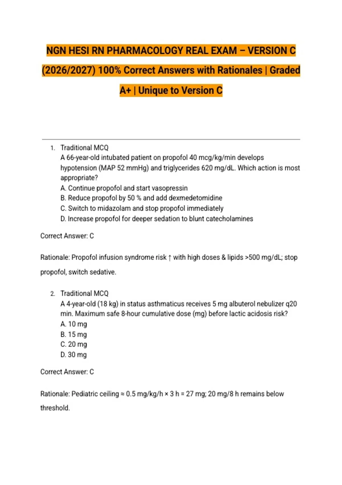 NGN HESI RN PHARMACOLOGY REAL EXAM – VERSION C (2026/2027) 100% Correct Answers with Rationales | Graded A+ | Unique to Version C