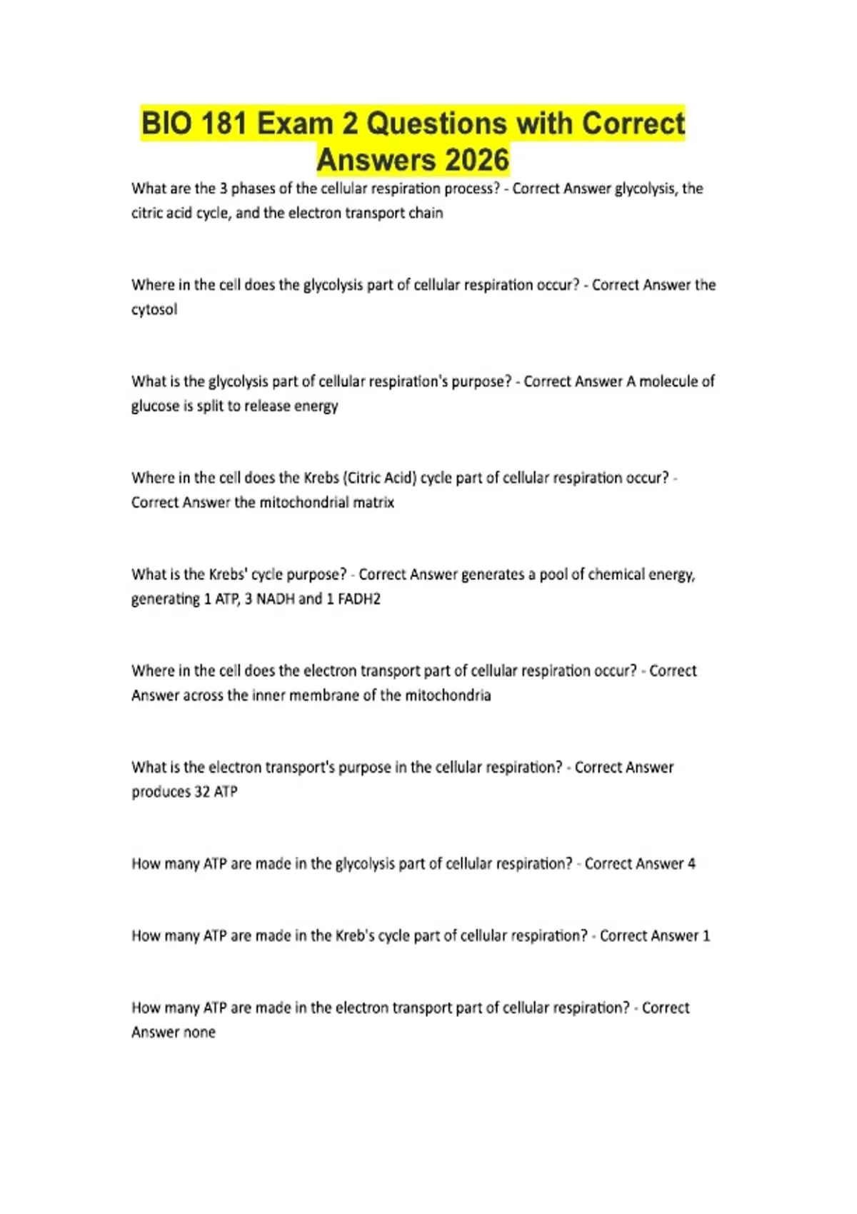 BIO 181 Exam 2 Questions with Correct Answers 2026 What are the 3 phases of the cellular respiration process? - Correct Answer glycolysis, the citric acid cycle, and the electron transport chain Where in the cell does the glycolysis part of cellular respiration occur? - Correct Answer the cytosol What is the glycolysis part of cellular respiration's purpose? - Correct Answer A molecule of glucose is split to release energy Where in the cell does the Krebs (Citric Acid) cycle part of cellular respiration occur? - Correct Answer the mitochondrial matrix What is the Krebs' cycle purpose? - Correct Answer generates a pool of chemical energy, generating 1 ATP, 3 NADH and 1 FADH2 Where in the cell does the electron transport part of cellular respiration occur? - Correct Answer across the inner membrane of the mitochondria What is the electron transport's purpose in the cellular respiration? - Correct Answer produces 32 ATP How many ATP are made in the glycolysis part of cellular respiration? - Correct Answer 4 How many ATP are made in the Kreb's cycle part of cellular respiration? - Correct Answer 1 How many ATP are made in the electron transport part of cellular respiration? - Correct Answer none