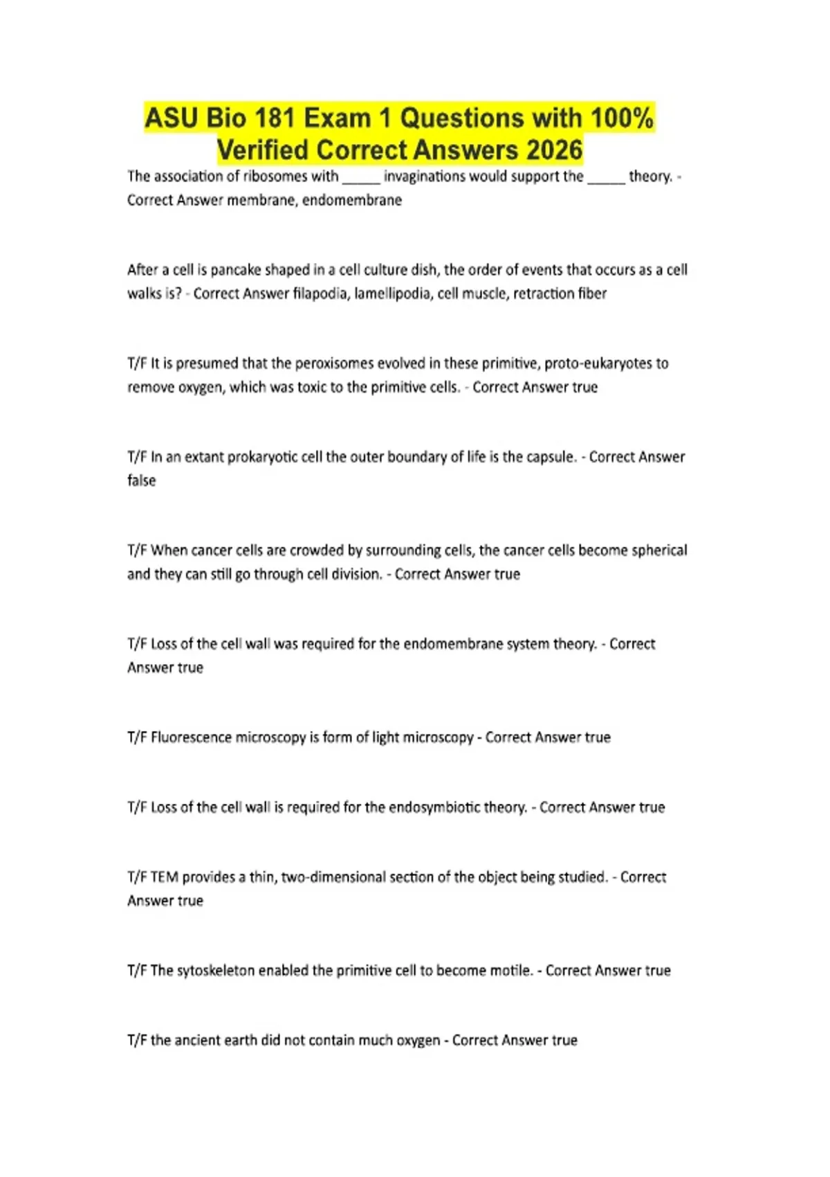 ASU Bio 181 Exam 1 Questions with 100% Verified Correct Answers 2026 The association of ribosomes with _____ invaginations would support the _____ theory. - Correct Answer membrane, endomembrane After a cell is pancake shaped in a cell culture dish, the order of events that occurs as a cell walks is? - Correct Answer filapodia, lamellipodia, cell muscle, retraction fiber T/F It is presumed that the peroxisomes evolved in these primitive, proto-eukaryotes to remove oxygen, which was toxic to the primitive cells. - Correct Answer true T/F In an extant prokaryotic cell the outer boundary of life is the capsule. - Correct Answer false T/F When cancer cells are crowded by surrounding cells, the cancer cells become spherical and they can still go through cell division. - Correct Answer true T/F Loss of the cell wall was required for the endomembrane system theory. - Correct Answer true T/F Fluorescence microscopy is form of light microscopy - Correct Answer true T/F Loss of the cell wall is required for the endosymbiotic theory. - Correct Answer true T/F TEM provides a thin, two-dimensional section of the object being studied. - Correct Answer true T/F The sytoskeleton enabled the primitive cell to become motile. - Correct Answer true T/F the ancient earth did not contain much oxygen - Correct Answer true