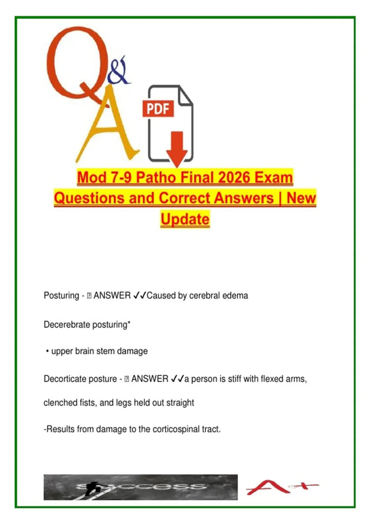 This expertly structured Q&A study guide for Modules 7 through 9 in Pathophysiology prepares nursing students for the 2026 final exam. The content includes critical neurological conditions (stroke types, aphasia, posturing), seizure classifications, autoimmune and spinal disorders, pain types, stress physiology, and musculoskeletal diseases like gout and osteoporosis. Also features a detailed breakdown of the five stages of bone healing. Ideal for last-minute prep and NCLEX-style review. Keywords: neurological disorders stroke types and symptoms aphasia brain posturing seizure classifications multiple sclerosis spinal cord injury levels stress response sympathetic nervous system types of pain gout pathophysiology osteoporosis risk factors bone healing stages nursing final exam prep
