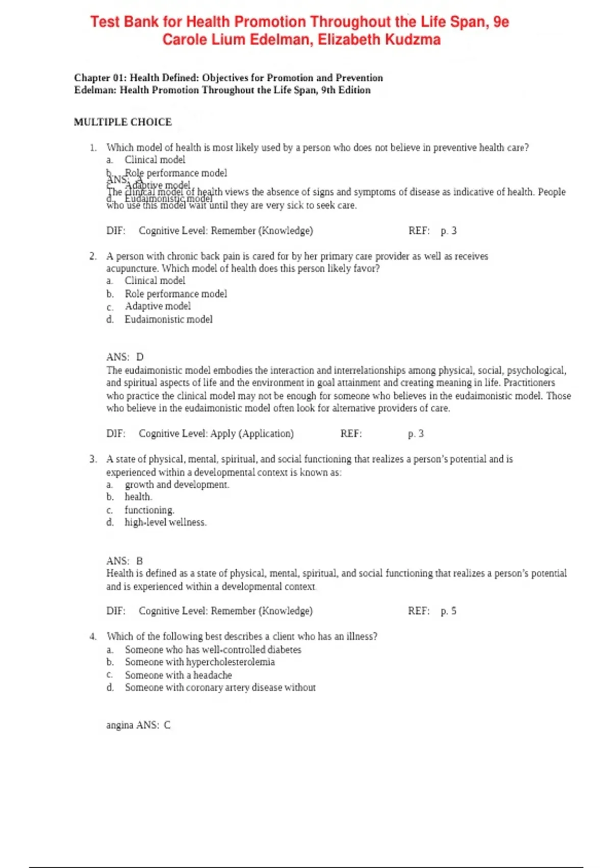 Chapter 01: Health Defined: Objectives for Promotion and Prevention