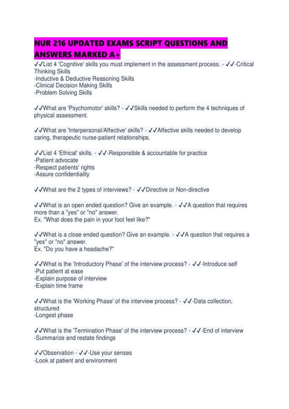 NUR 216 UPDATED EXAMS SCRIPT QUESTIONS AND