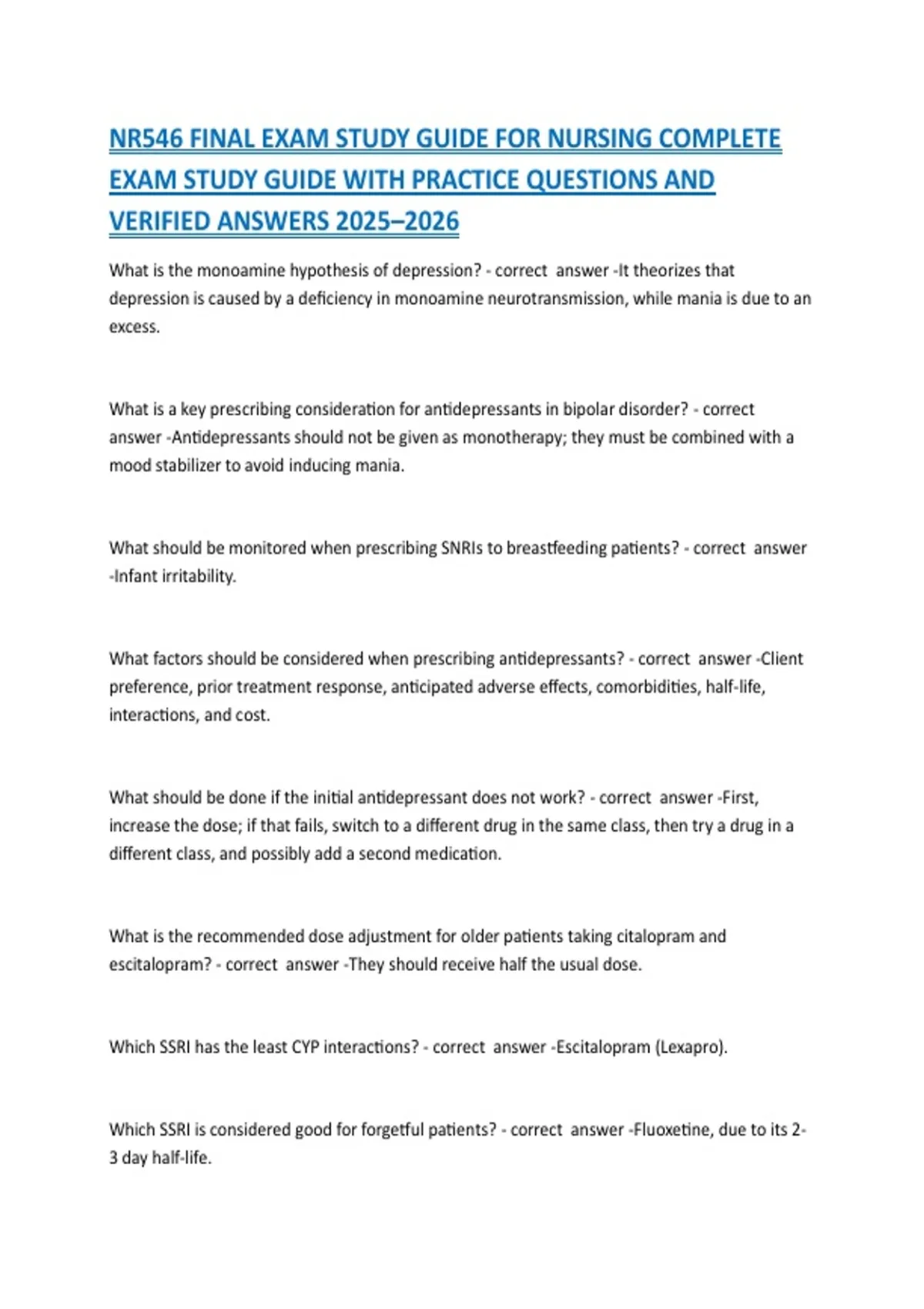 NR546 FINAL EXAM STUDY GUIDE FOR NURSING COMPLETE EXAM STUDY GUIDE WITH PRACTICE QUESTIONS AND VERIFIED ANSWERS 2025–2026