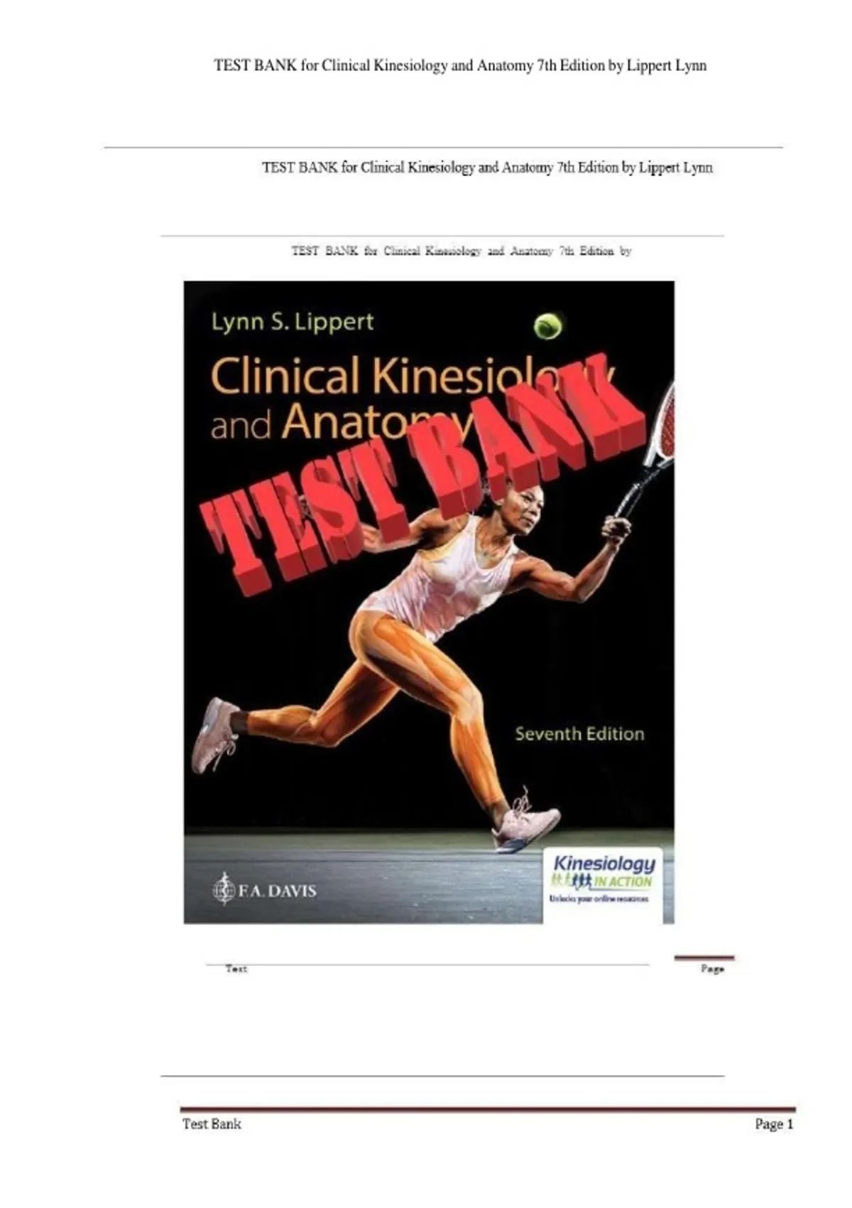 Prepare effectively for exams with this comprehensive Test Bank for Clinical Kinesiology and Anatomy, Seventh Edition, fully updated for 2026! Authored by Lynn S. Lippert, this test bank provides a wide range of exam-style multiple-choice questions with accurate answer rationales designed to reinforce understanding of human movement, musculoskeletal anatomy, and biomechanical principles. This resource covers essential topics including joint structure and function, muscle actions, biomechanics, posture and gait analysis, functional movement patterns, and clinical applications of kinesiology in rehabilitation and health sciences. Questions are aligned with typical classroom assessments, making this test bank ideal for quizzes, midterms, finals, and comprehensive course review. Covers all major joints and muscle groups Strengthens understanding of movement and biomechanics Ideal for kinesiology, physical therapy, athletic training, and health science students A reliable study companion for mastering clinical kinesiology and anatomy concepts and achieving strong exam performance.