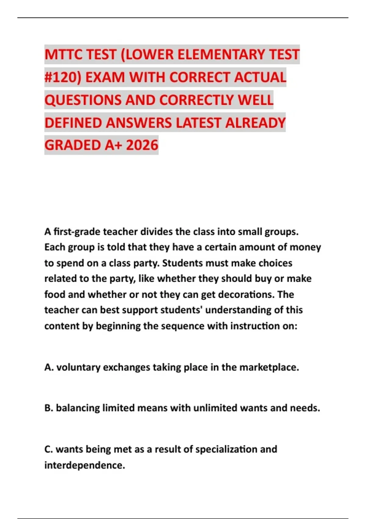 MTTC TEST (LOWER ELEMENTARY TEST #120) EXAM WITH CORRECT ACTUAL QUESTIONS AND CORRECTLY WELL DEFINED ANSWERS LATEST ALREADY GRADED A+ 2026