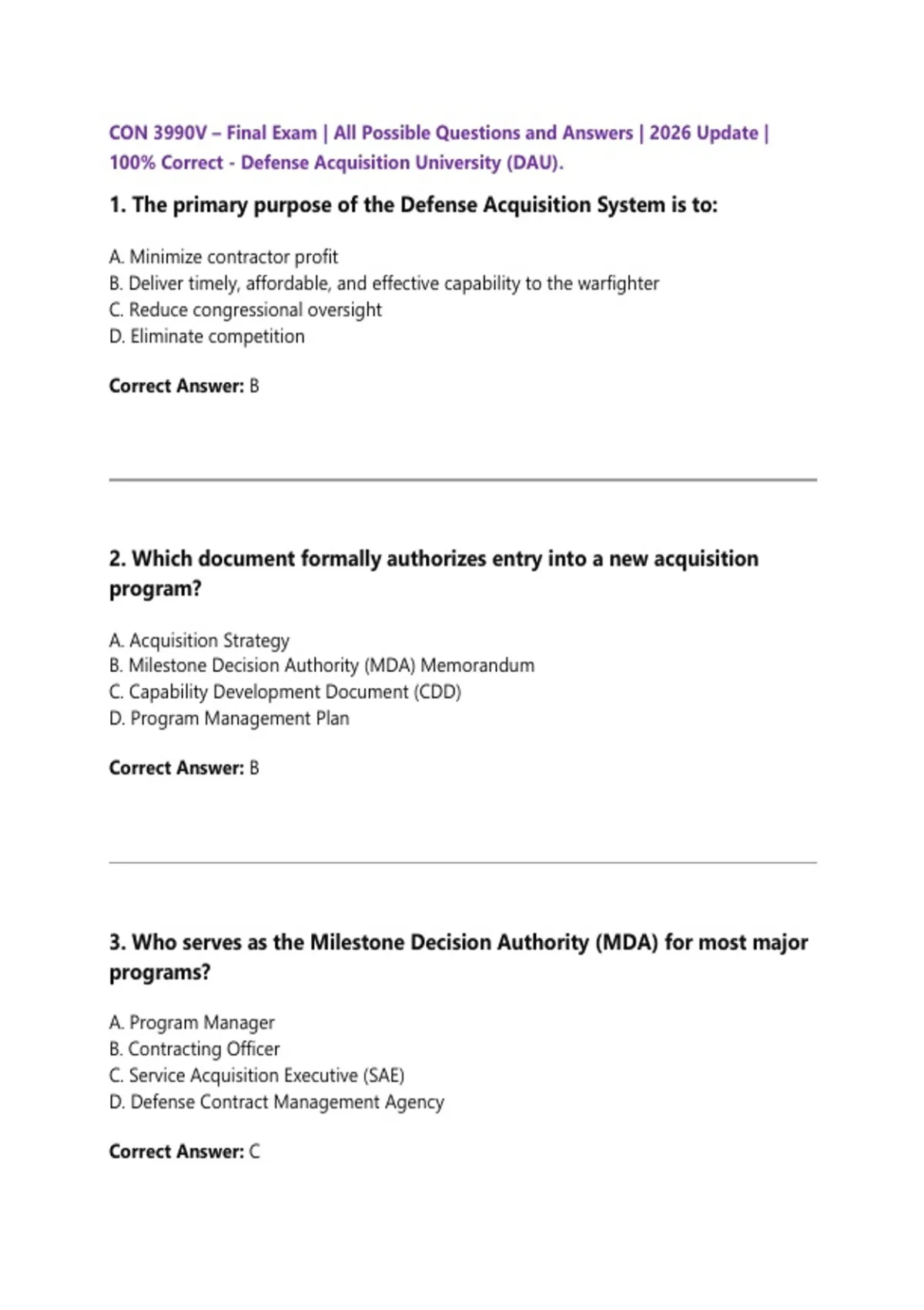 CON 3990V – Final Exam | All Possible Questions and Answers | 2026 Update | 100% Correct - Defense Acquisition University (DAU). CON 3990V Defense Acquisition Management – Final Exam Material, Defense Acquisition University (DAU), 2026 | Complete exam questions and answers