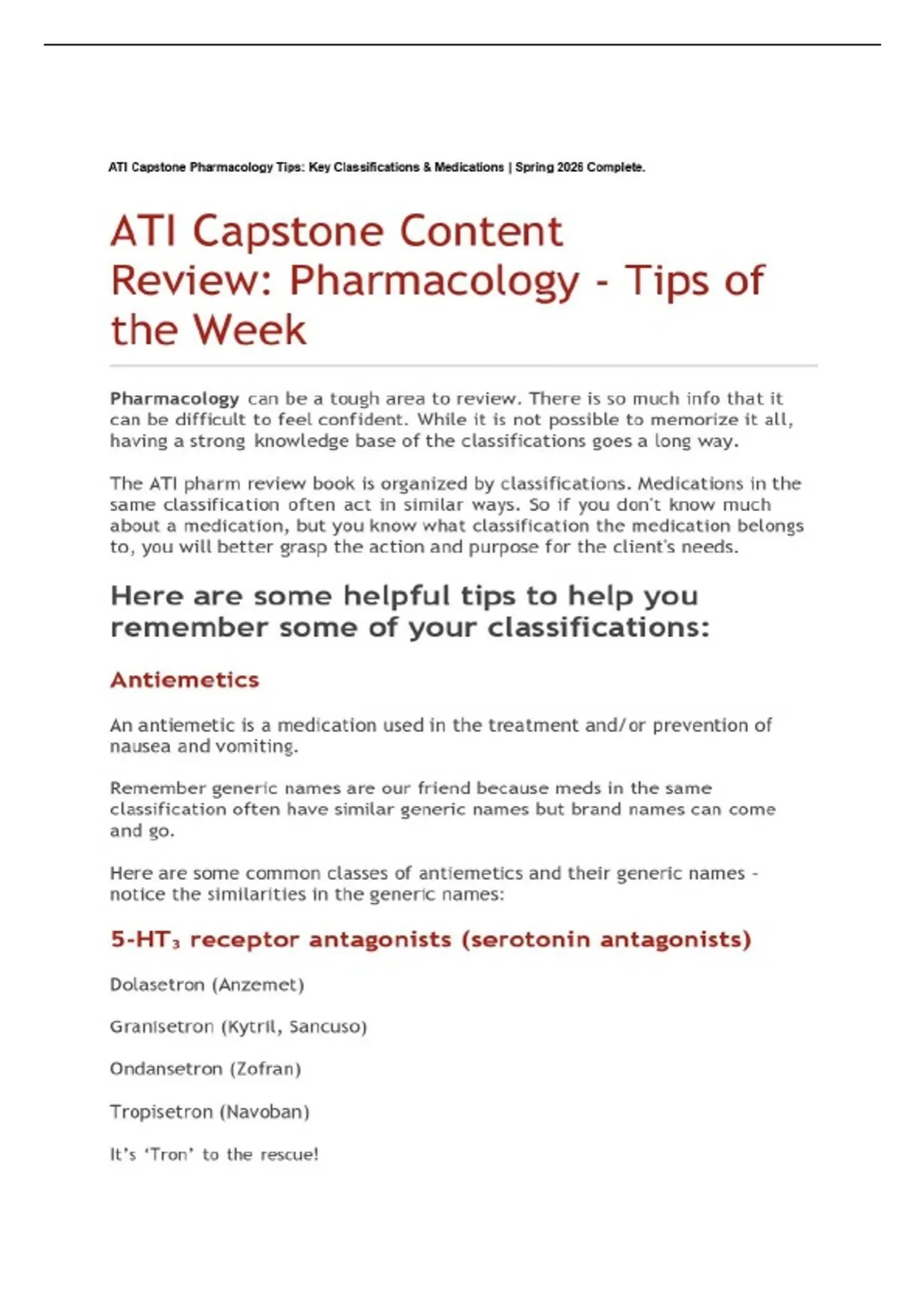 ATI Capstone Pharmacology Tips: Key Classifications & Medications | Spring 2026 Complete. This document provides a structured overview of key pharmacology concepts for the ATI Capstone exam, including medication classifications, mechanisms of action, side effects, nursing considerations, and test-taking tips. It covers major drug groups such as antiemetics, proton pump inhibitors, statins, anticoagulants, antiplatelets, thrombolytics, insulin types, and common herbal therapies. The material is designed as a practical review tool aligned with ATI and NCLEX-style questions for nursing students preparing for capstone assessments.