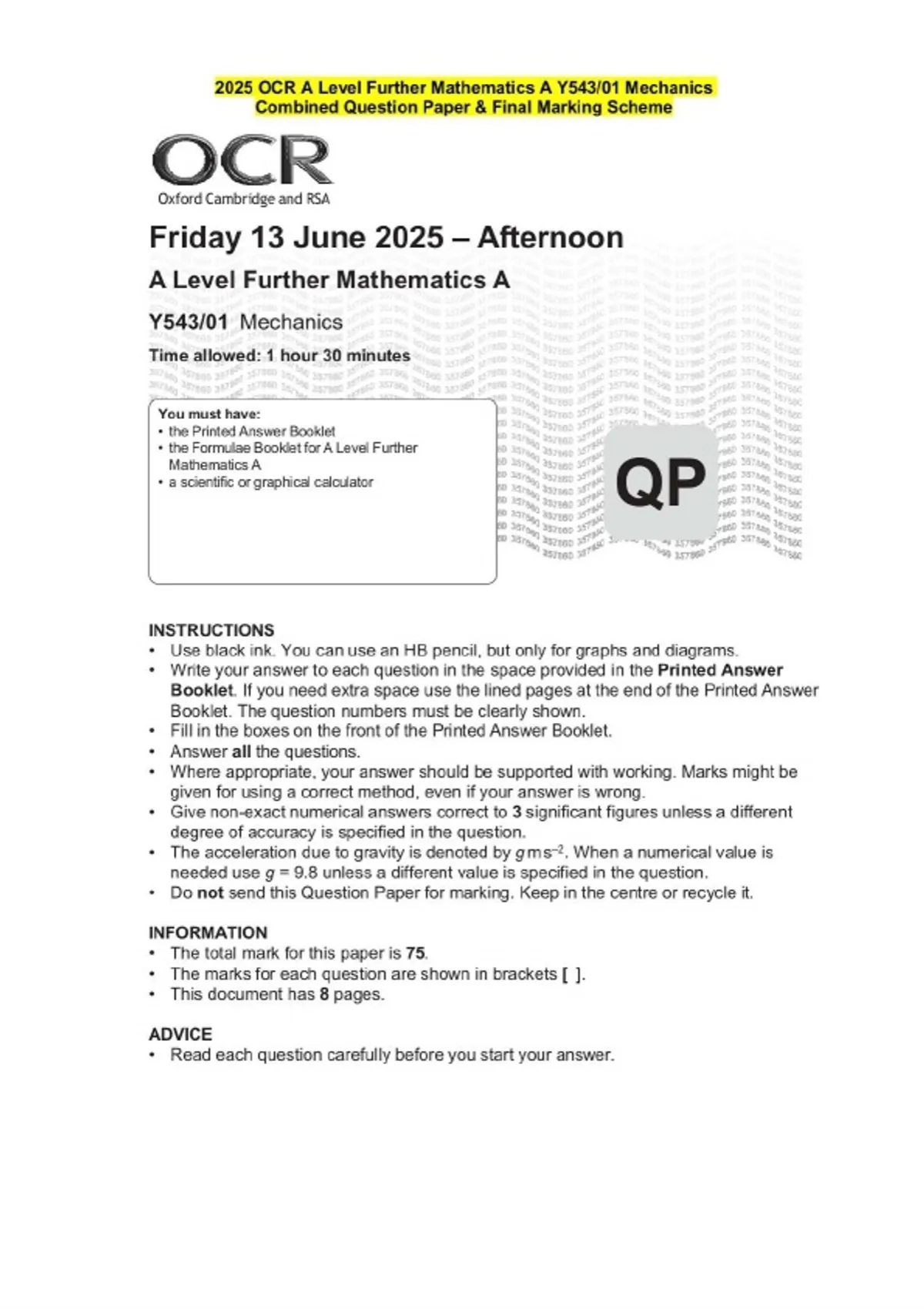 This document contains a comprehensive and integrated 2025 OCR A Level Further Mathematics A (Y543/01) Mechanics question paper with a complete final marking scheme. It is designed to assess key mechanics concepts and problem-solving skills in line with the OCR specification, making it suitable for revision, exam preparation, and academic reference.