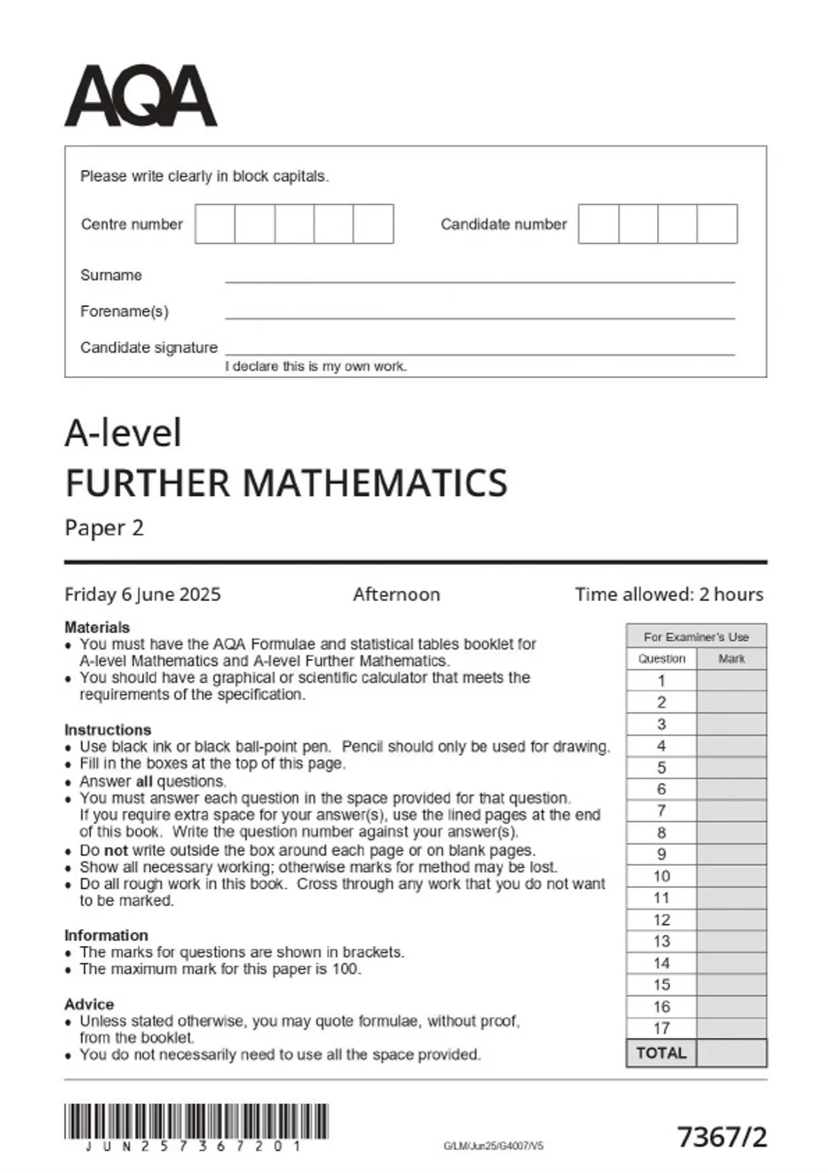 2025 aqa a level further mathematics 73672
