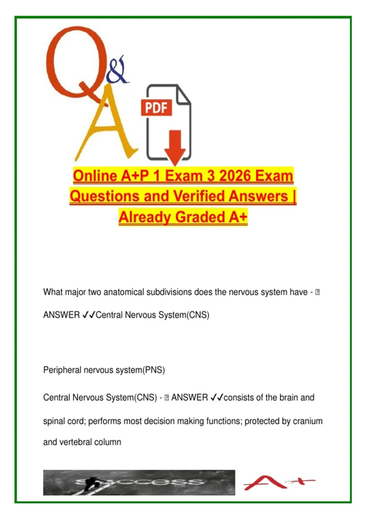 This document features 50 thoroughly verified and A+ graded questions and answers from Exam 3 of Anatomy and Physiology I (BIOL 2401), with a complete focus on the nervous system. It comprehensively reviews the major divisions of the nervous system (CNS and PNS), functional subdivisions (somatic and autonomic), neuron structure (axon, dendrites, soma, axolemma), and neurophysiological concepts such as excitability, conductivity, and secretion. Key content includes classifications of neurons, neuroglial cell types (astrocytes, microglia, oligodendrocytes, etc.), axonal transport mechanisms (anterograde, retrograde, fast and slow), and neurotransmission. This material is ideal for undergraduate students in nursing, biology, pre-med, pre-nursing, kinesiology, and other health science disciplines. It is especially beneficial for online or remote learners enrolled in anatomy and physiology courses looking for reliable, high-quality exam preparation that mirrors actual course content. Keywords: nervous system, central nervous system, peripheral nervous system, neurons, neuroglia, sensory neurons, motor neurons, interneurons, axon transport, somatic division, autonomic nervous system, sympathetic division, parasympathetic division, BIOL 2401, anatomy and physiology exam, verified answers, neurophysiology, CNS, PNS, A&P 1