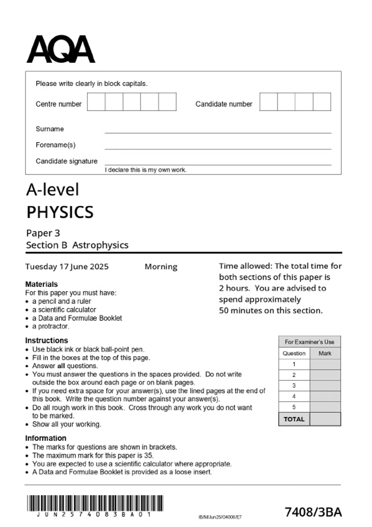 2025 AQA A-LEVEL Physics 7408/3 Paper 3 Section B Astrophysics MERGED QUESTION PAPER & MARKSCHEME