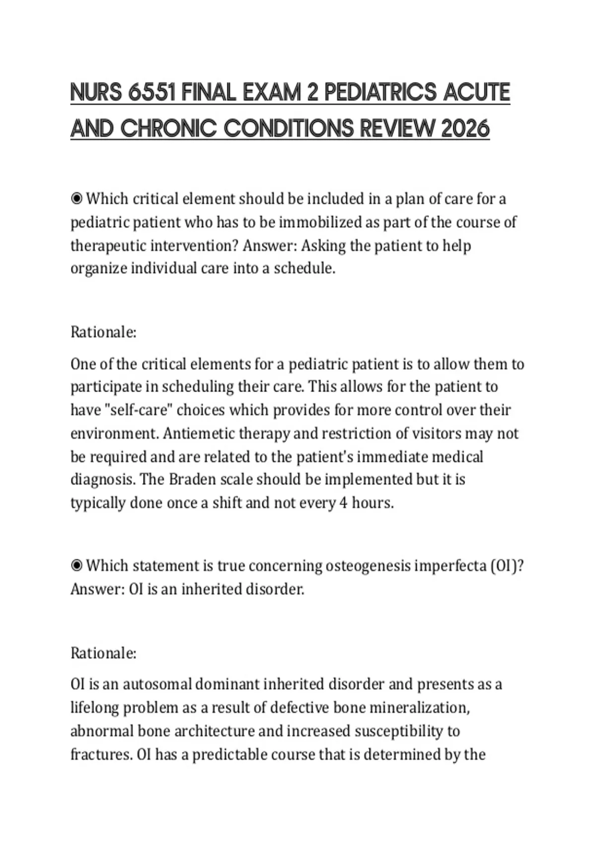 NURS 6551 FINAL EXAM 2 PEDIATRICS ACUTE AND CHRONIC CONDITIONS REVIEW 2026