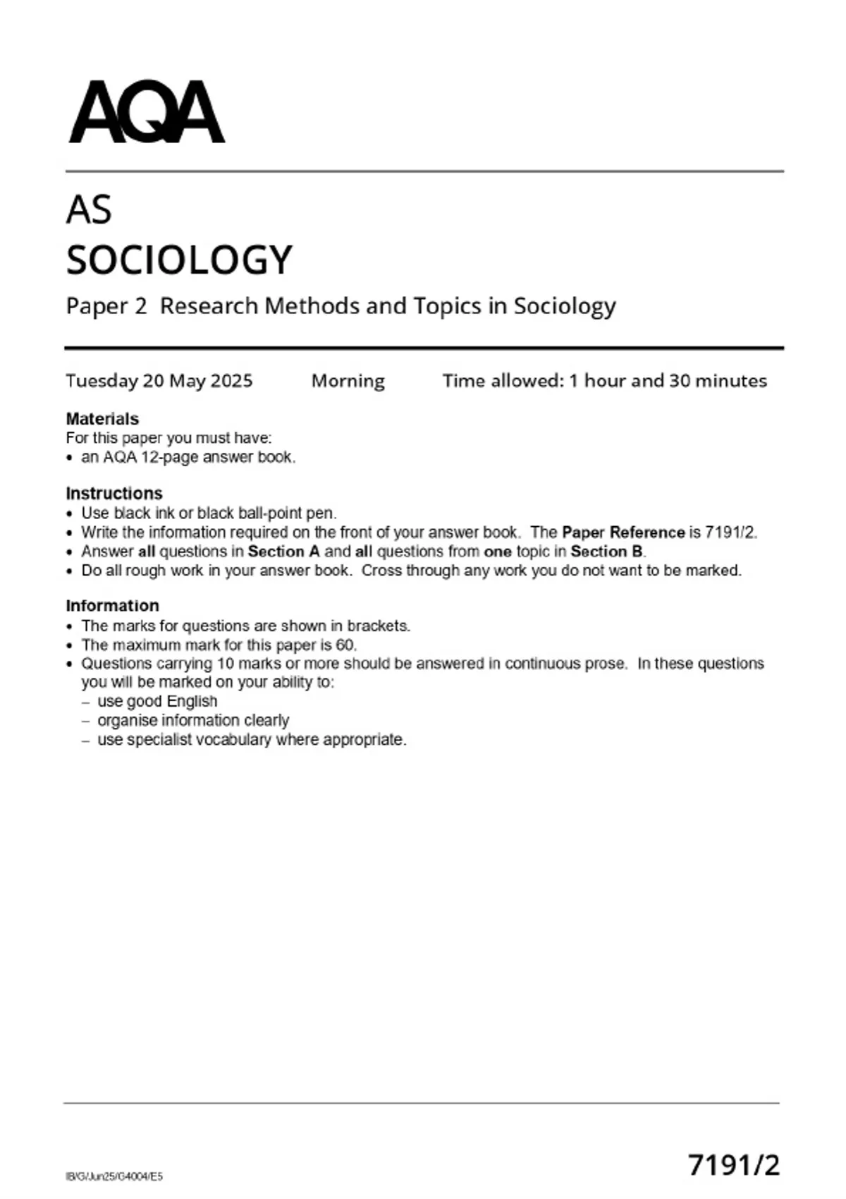2025 AQA AS Sociology 7191/2 Paper 2 Research methods and topics in Sociology MERGED QUESTION PAPER & MARKSCHEME