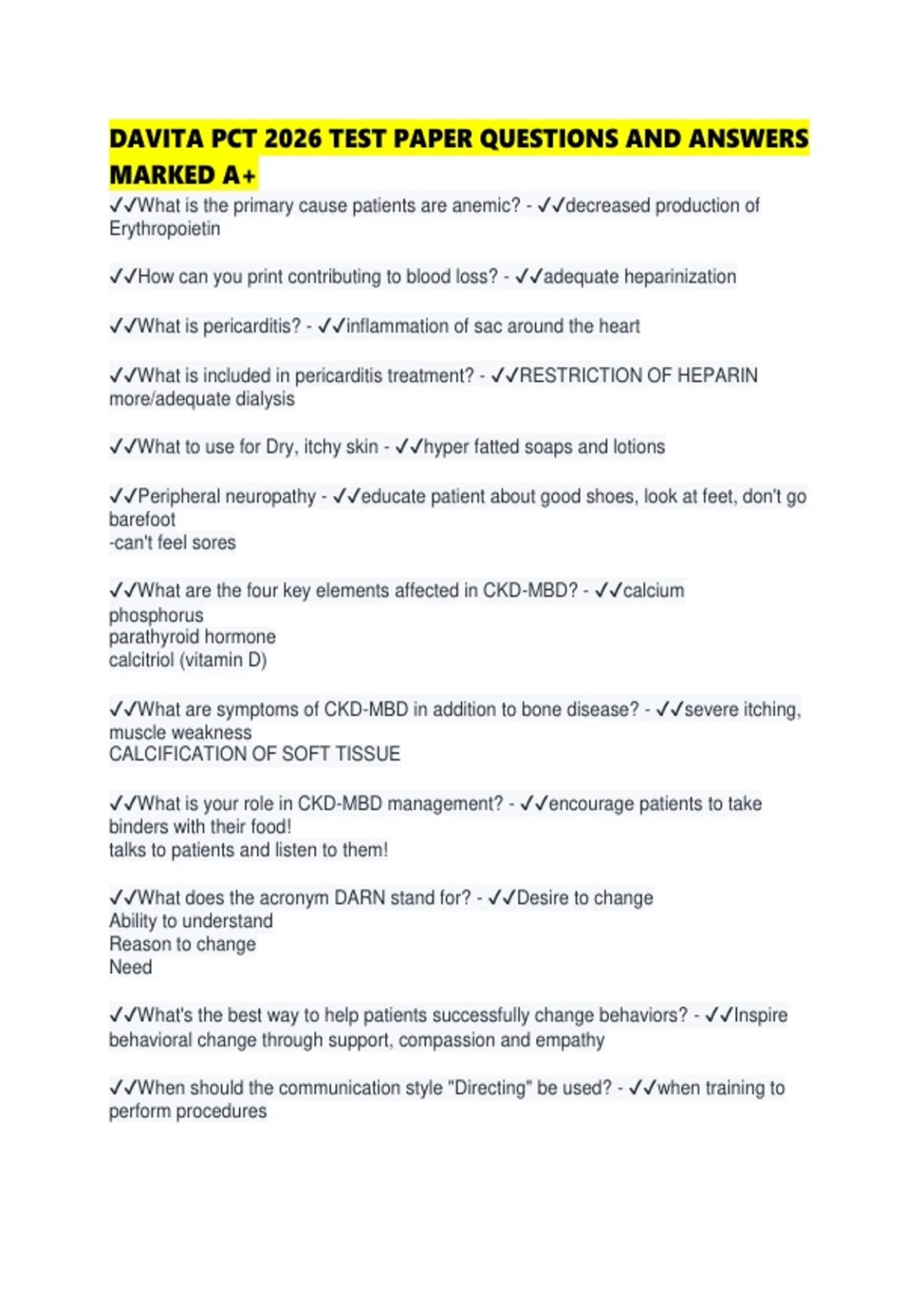DAVITA PCT 2026 TEST PAPER QUESTIONS AND ANSWERS MARKED
