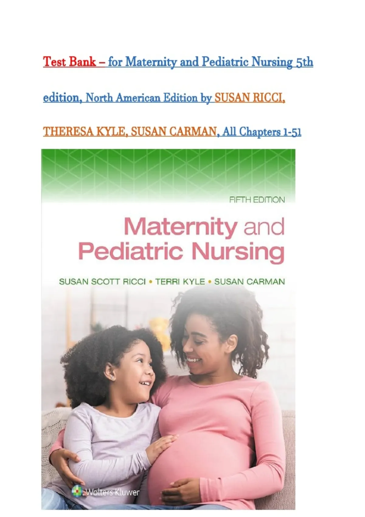 Test Bank - for Maternity and Pediatric Nursing Fifth, North American Edition by SUSAN RICCI, THERESA KYLE, SUSAN CARMAN, All Chapters 1-51 | Complete Guide A+|Latest 2026