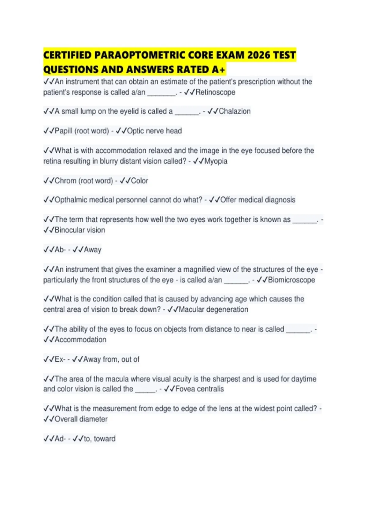 CERTIFIED PARAOPTOMETRIC CORE EXAM 2026 TEST QUESTIONS AND ANSWERS RATED