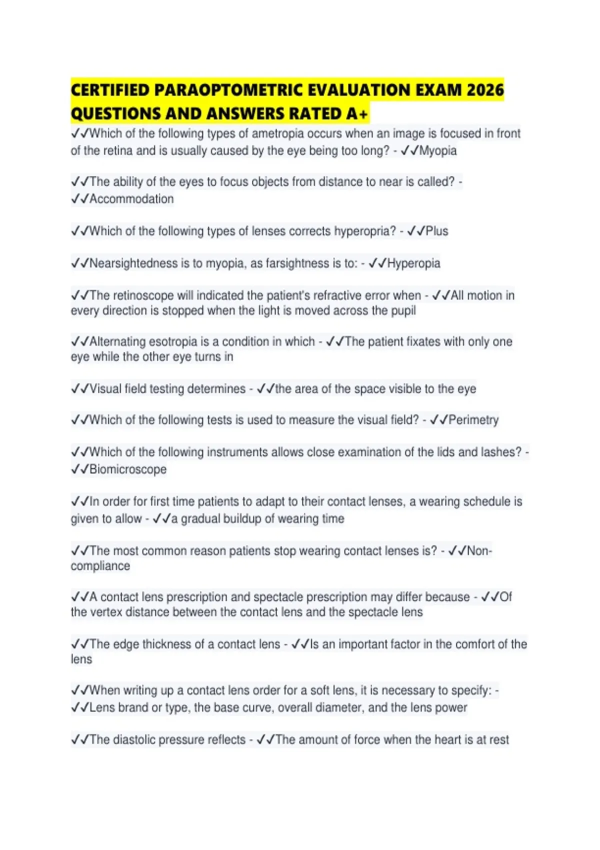 CERTIFIED PARAOPTOMETRIC EVALUATION EXAM 2026 QUESTIONS AND ANSWERS RATED