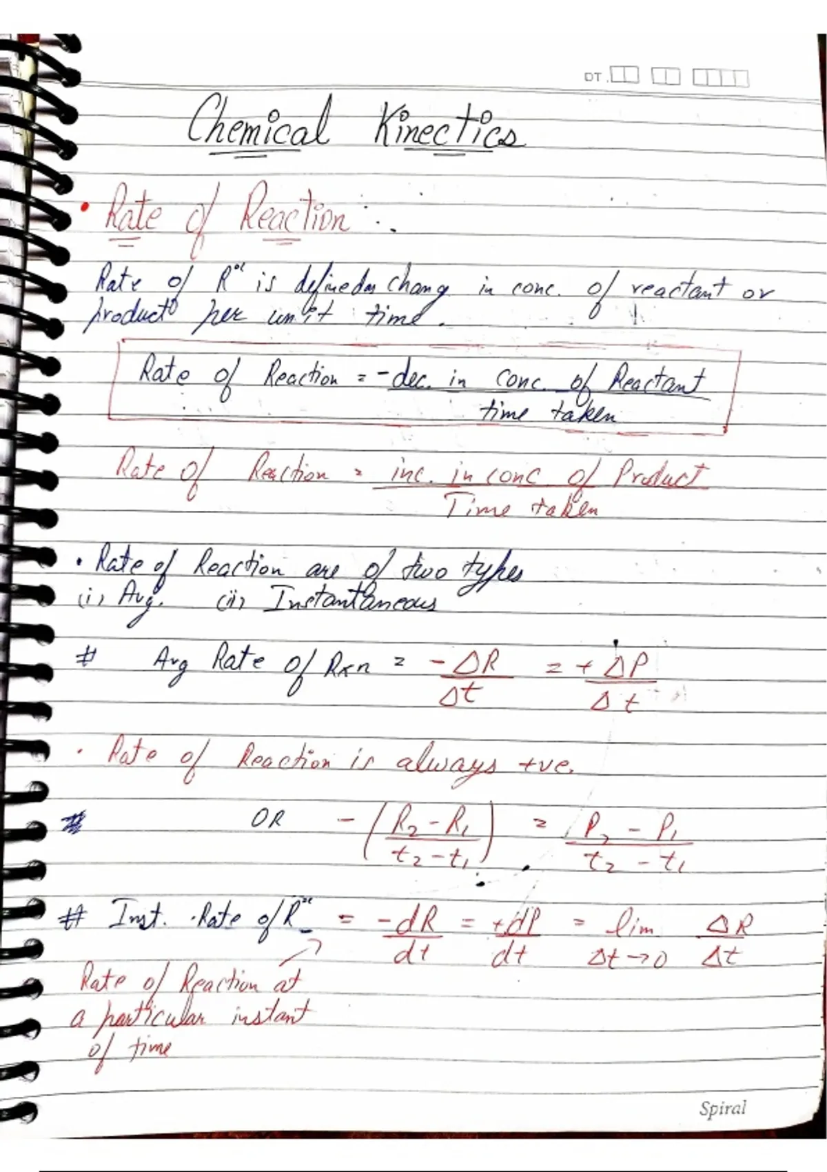Chemical kinetics is the branch of chemistry that studies how fast chemical reactions occur and what factors affect their rate. In simple words, it explains the speed of a reaction and the steps by which reactants change into products. What chemical kinetics studies Rate of reaction – how quickly reactants are converted into products Reaction mechanism – the step-by-step process of a reaction Factors affecting reaction rate Factors affecting the rate of reaction 1. Concentration of reactants Higher concentration → more collisions → faster reaction 2. Temperature Higher temperature → particles move faster → reaction rate increases 3. Surface area Finely divided solids react faster than large pieces 4. Catalyst A catalyst speeds up a reaction without being consumed 5. Nature of reactants Some substances react faster than others Importance of chemical kinetics Helps in industrial production (fertilizers, medicines, plastics) Useful in environmental chemistry (pollution control) Important in biological processes (enzyme reactions)