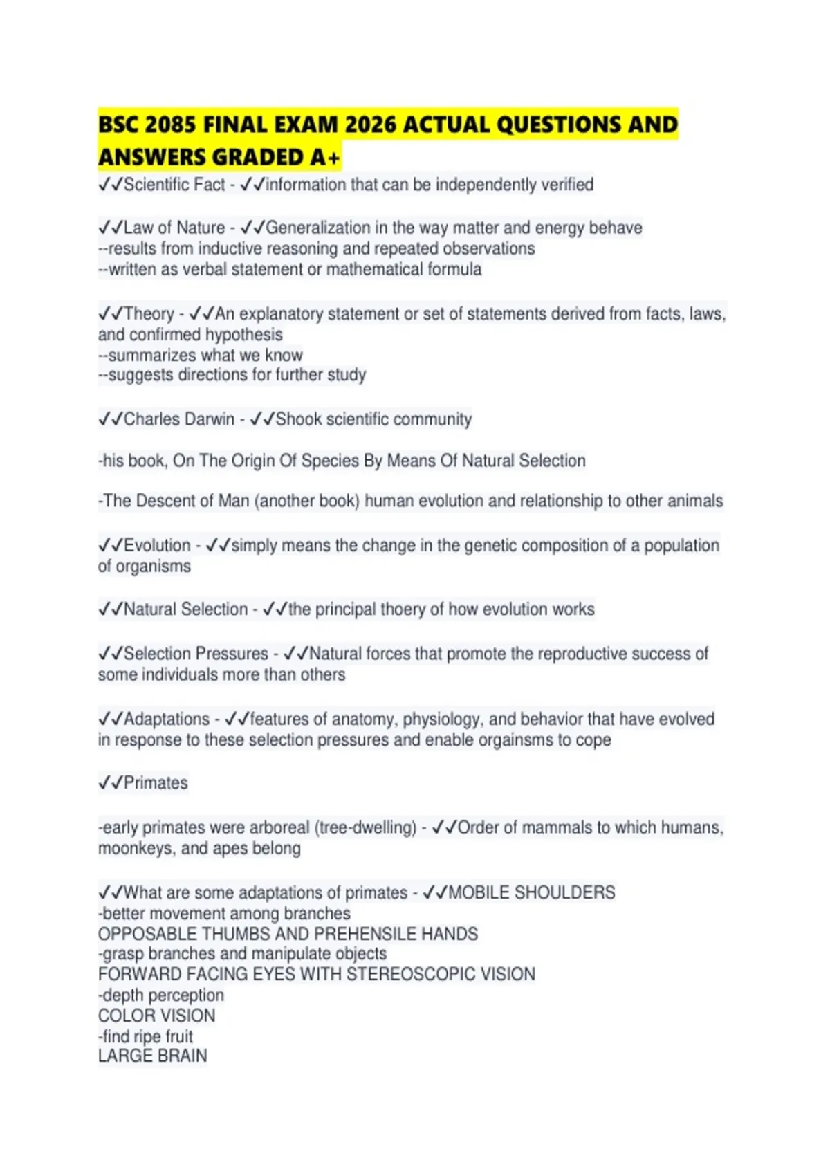 BSC 2085 FINAL EXAM 2026 ACTUAL QUESTIONS AND ANSWERS GRADED