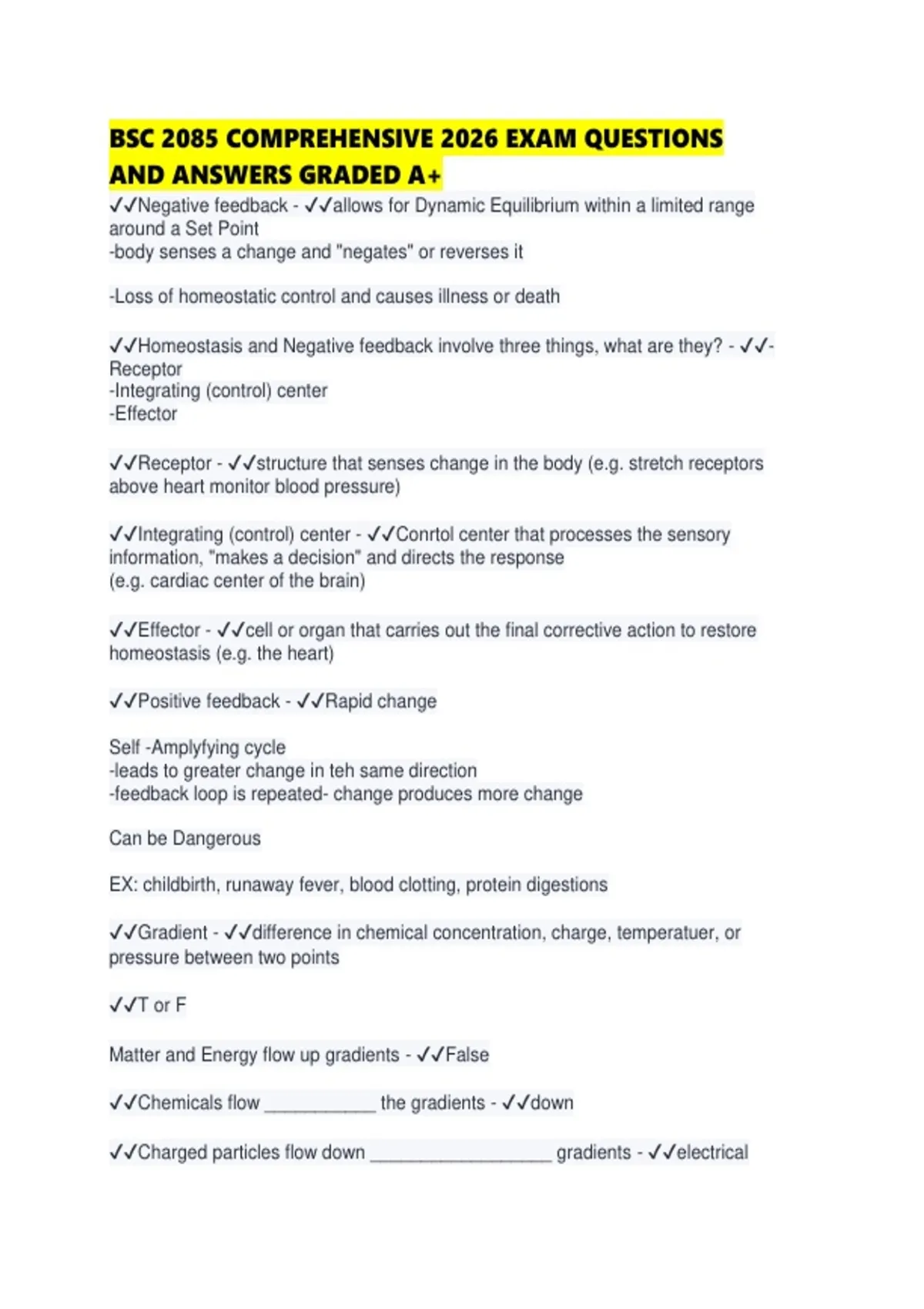 BSC 2085 COMPREHENSIVE 2026 EXAM QUESTIONS AND ANSWERS GRADED