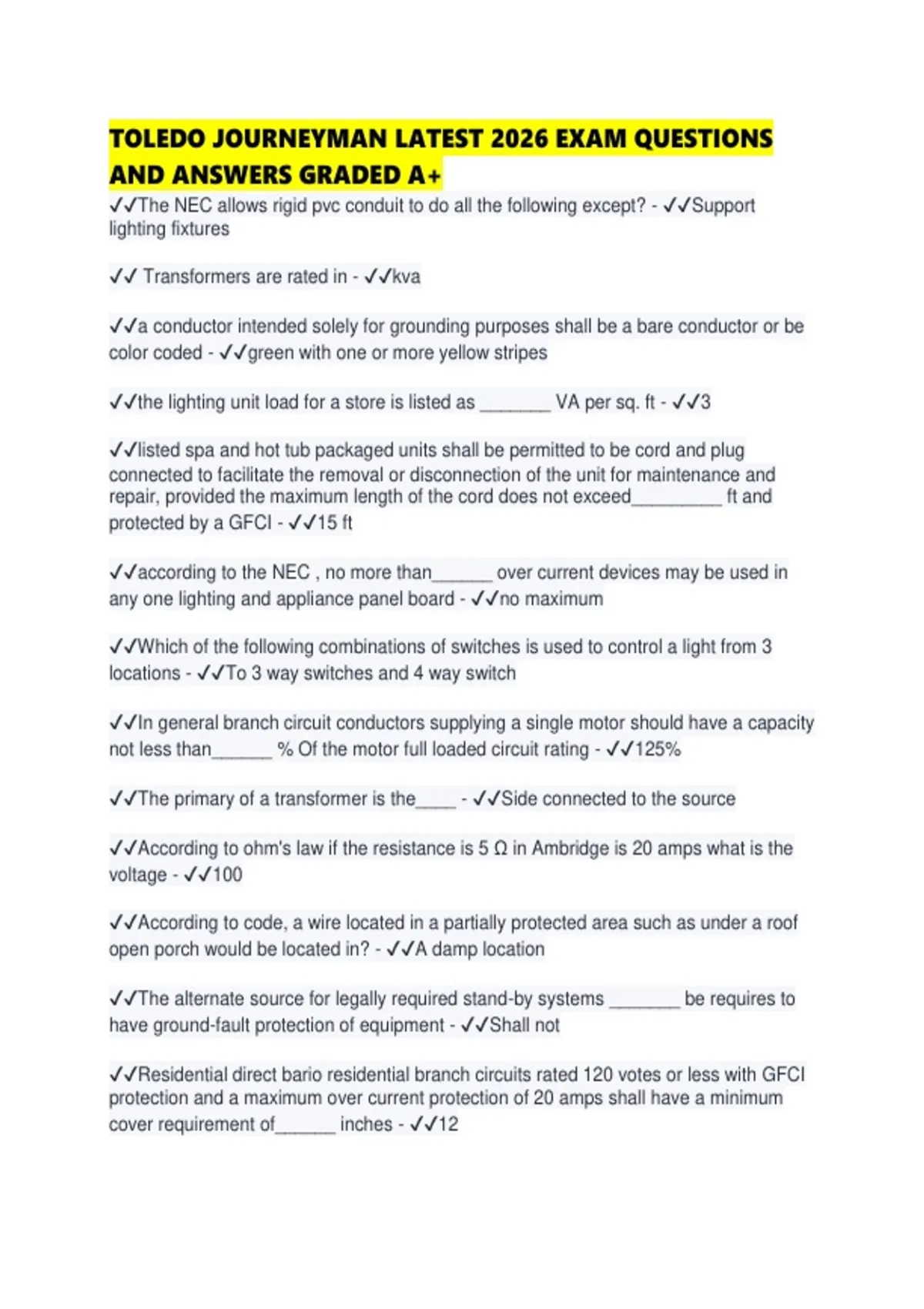TOLEDO JOURNEYMAN LATEST 2026 EXAM QUESTIONS AND ANSWERS GRADED