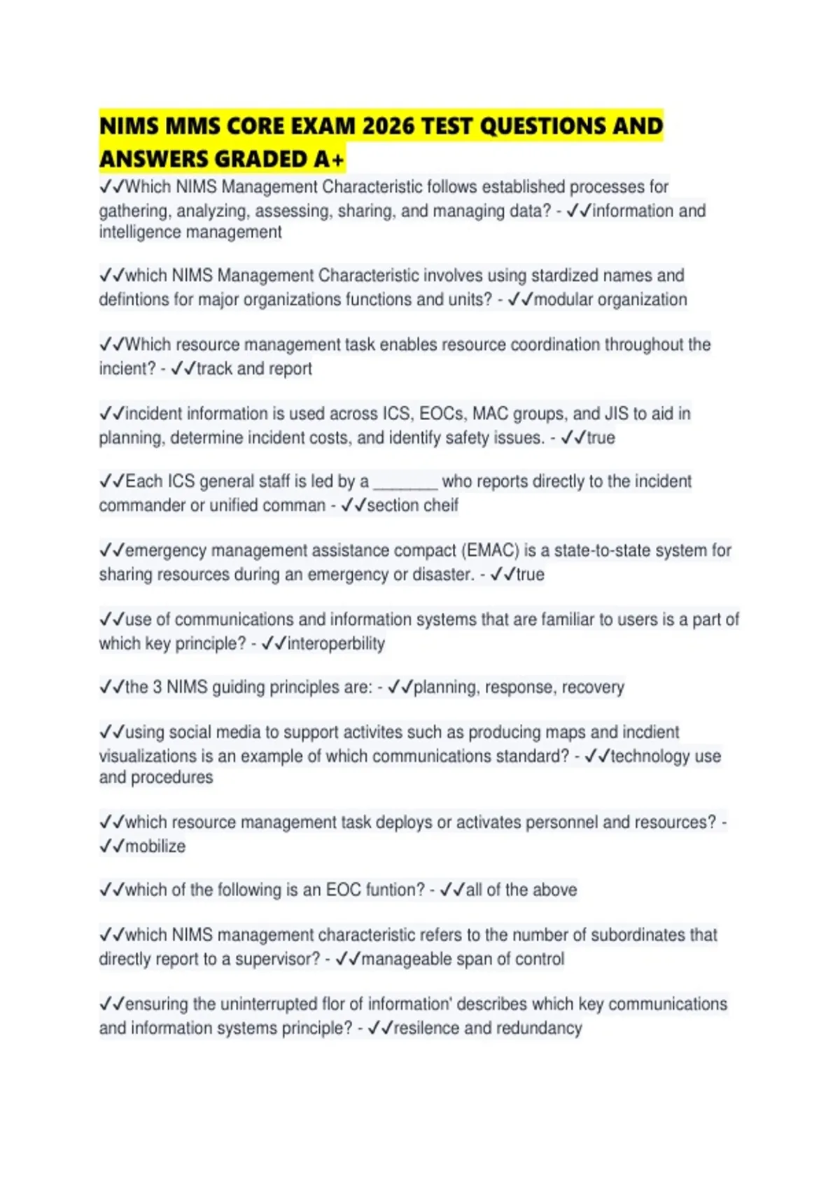 NIMS MMS CORE EXAM 2026 TEST QUESTIONS AND ANSWERS GRADED