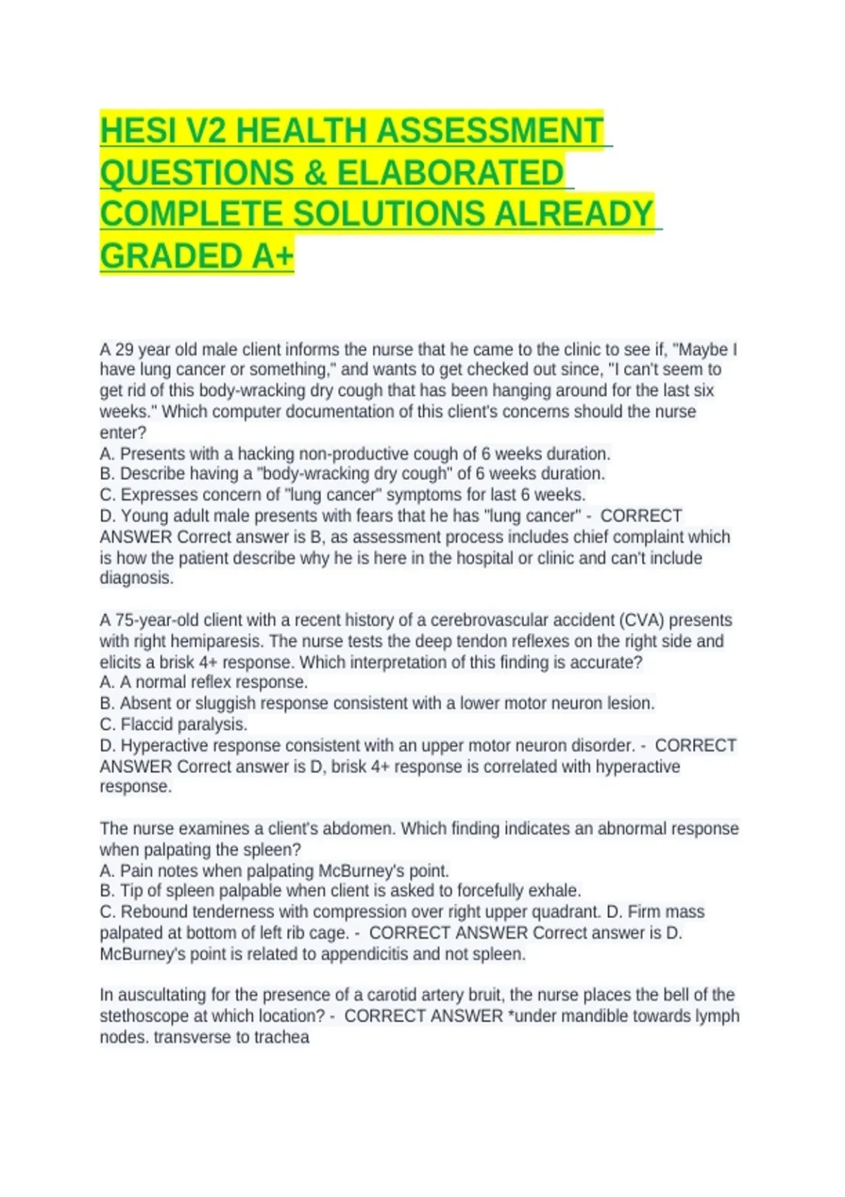 HESI V2 HEALTH ASSESSMENT QUESTIONS & ELABORATED COMPLETE SOLUTIONS ALREADY GRADED A+