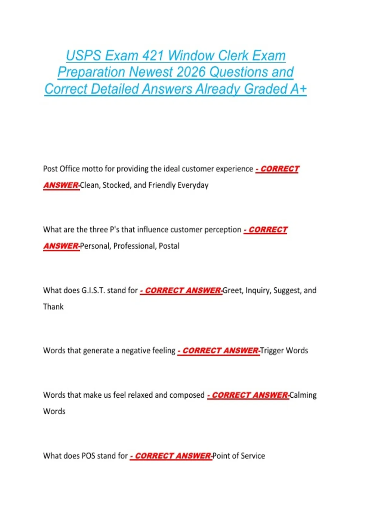 USPS Exam 421 Window Clerk Exam Preparation Newest 2026 Questions and Correct Detailed Answers Already Graded A+ USPS Exam 421 Window Clerk Exam Preparation Newest 2026 Questions and Correct Detailed Answers Already Graded A+