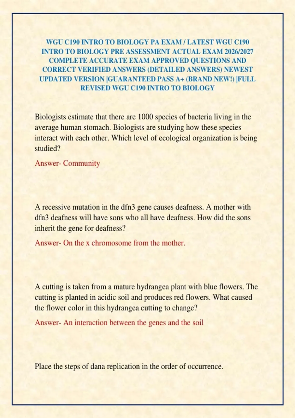 WGU C190 INTRO TO BIOLOGY PA EXAM / LATEST WGU C190 INTRO TO BIOLOGY PRE ASSESSMENT ACTUAL EXAM 2026/2027 COMPLETE ACCURATE EXAM APPROVED QUESTIONS AND CORRECT VERIFIED ANSWERS (DETAILED ANSWERS) NEWEST UPDATED VERSION |GUARANTEED PASS A+ (BRAND NEW!) |FU