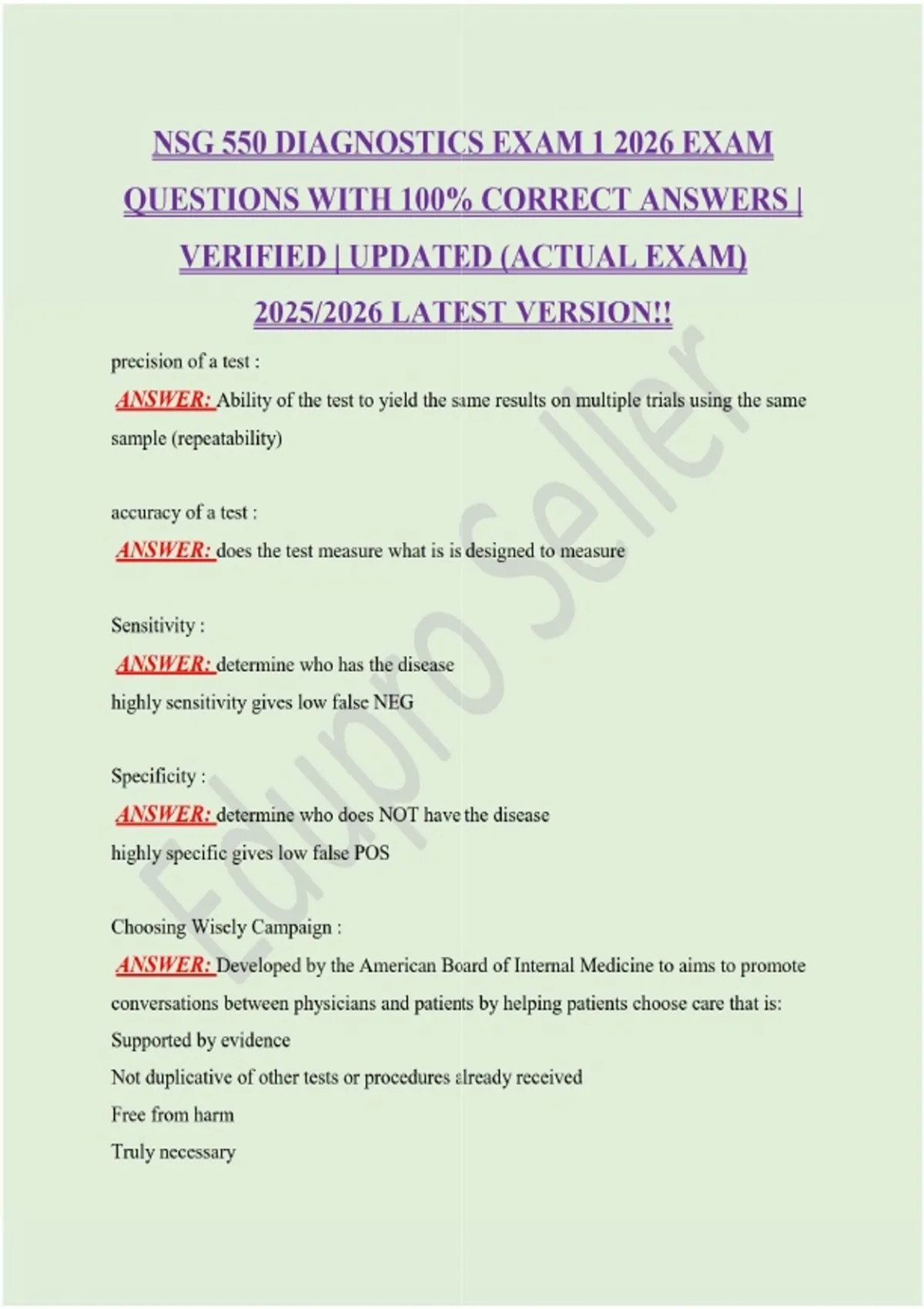 NSG 550 DIAGNOSTICS EXAM 1 2026 EXAM QUESTIONS WITH 100% CORRECT ANSWERS | VERIFIED | UPDATED (ACTUAL EXAM) 2025/2026 LATEST VERSION!!