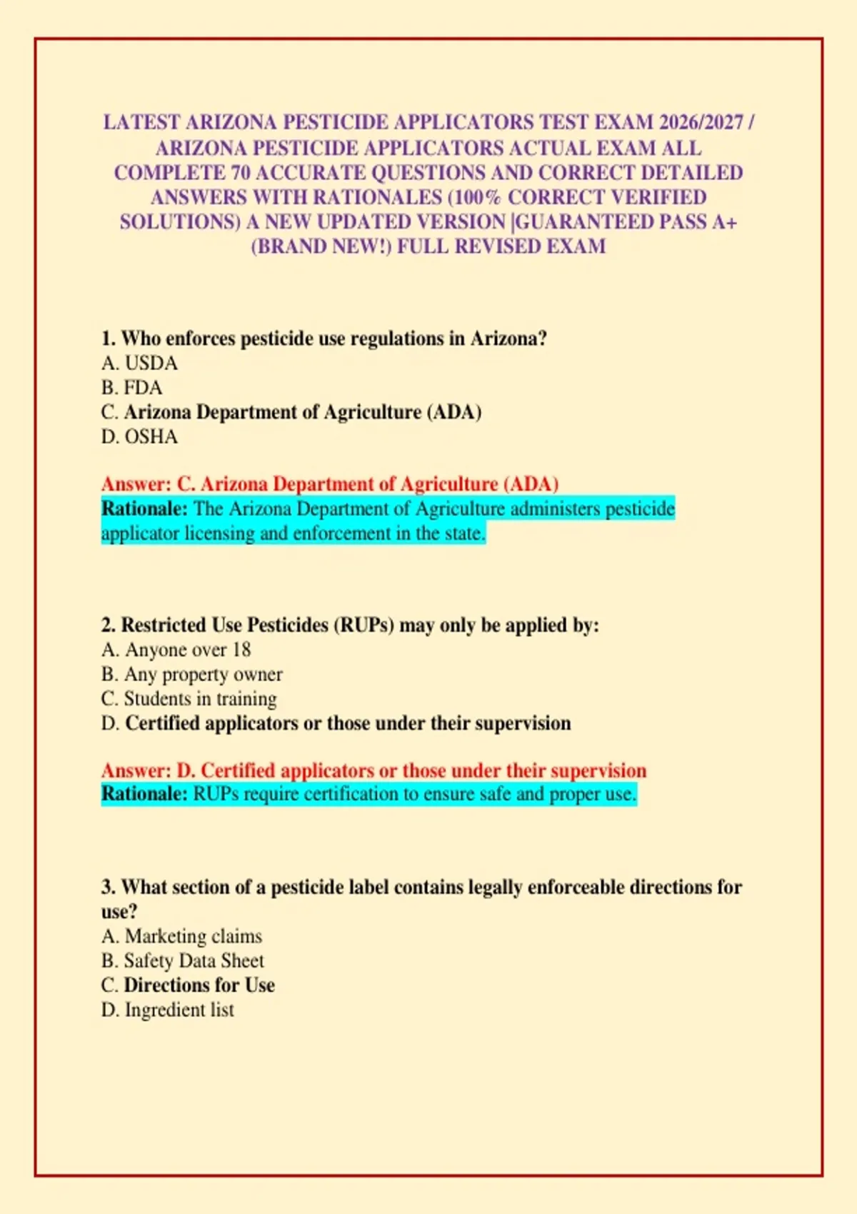 LATEST ARIZONA PESTICIDE APPLICATORS TEST EXAM 2026/2027 / ARIZONA PESTICIDE APPLICATORS ACTUAL EXAM ALL COMPLETE 70 ACCURATE QUESTIONS AND CORRECT DETAILED ANSWERS WITH RATIONALES (100% CORRECT VERIFIED SOLUTIONS) A NEW UPDATED VERSION |GUARANTEED PASS A
