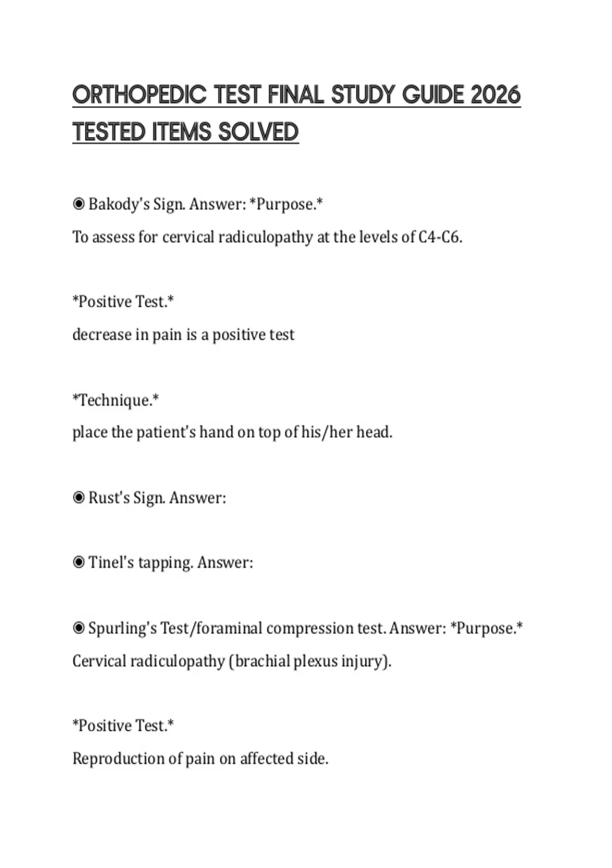 ORTHOPEDIC TEST FINAL STUDY GUIDE 2026
