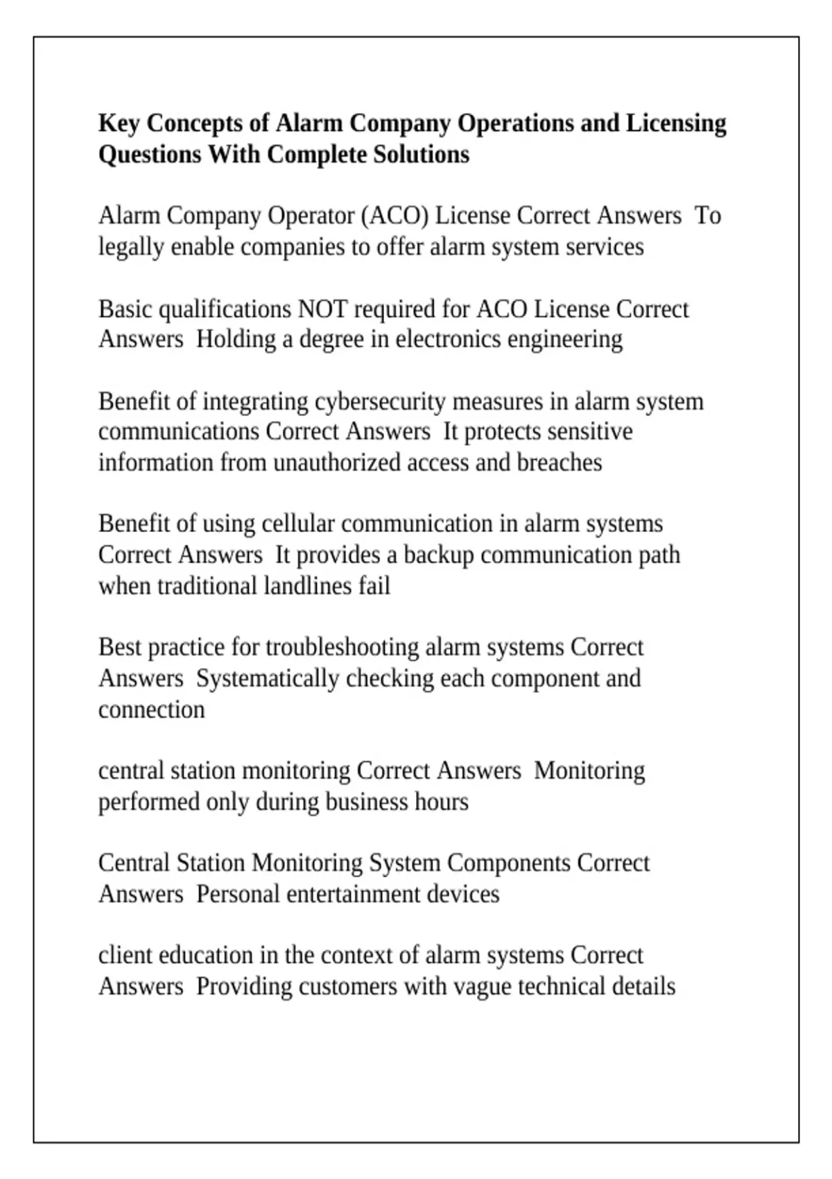 Alarm Company Operator (ACO) License Correct Answers To