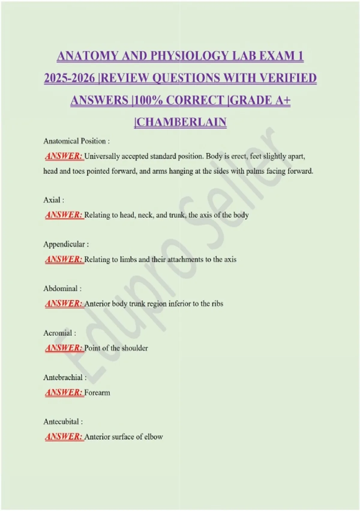 ANATOMY AND PHYSIOLOGY LAB EXAM |REVIEW QUESTIONS WITH VERIFIED ANSWERS |100% CORRECT |GRADE A+ |CHAMBERLAIN