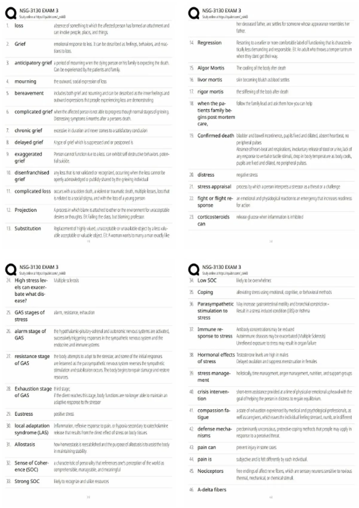 This NSG-3130 Exam 3 nursing exam review covers stress and adaptation, pain assessment and management, end-of-life care, death and dying theories, and grief and loss nursing interventions. Designed for nursing students preparing for exams, quizzes, and test banks with high-yield concepts to help score 100%.