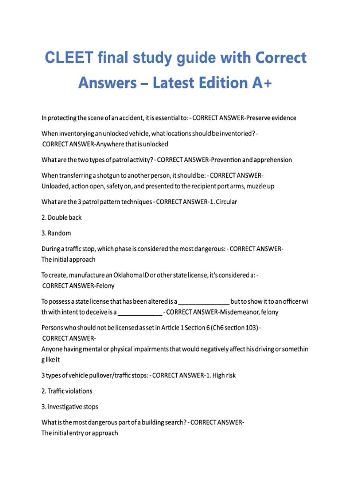 CLEET final study guide with Correct Answers – Latest Edition A+