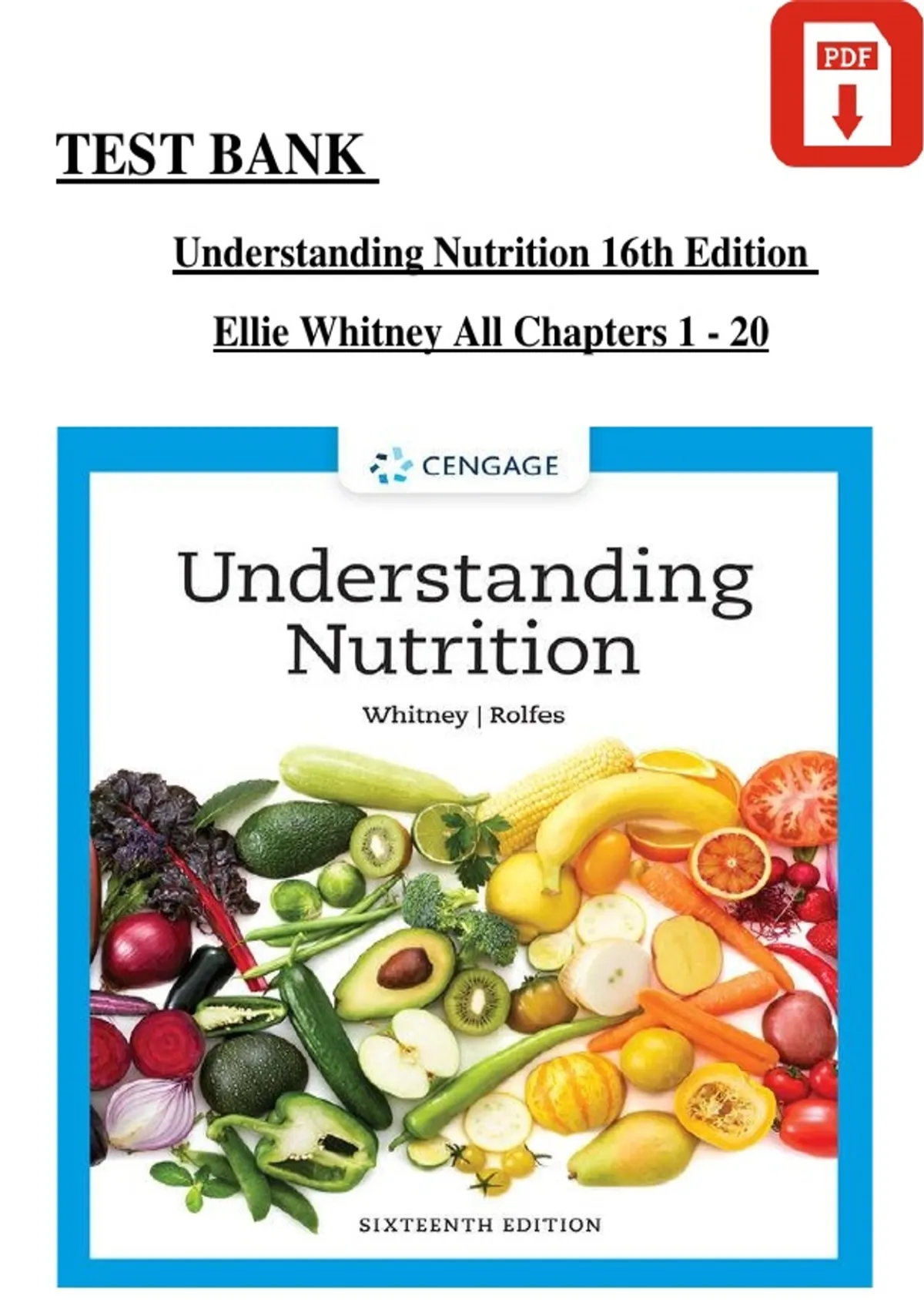 Prepare confidently for nutrition and health science exams with this comprehensive Test Bank for Understanding Nutrition, 16th Edition, fully updated for 2026! Authored by Ellie Whitney and Sharon Rolfes, this test bank provides high-quality, exam-style multiple-choice questions with detailed rationales to reinforce core nutrition principles and evidence-based dietary guidelines. This resource covers essential topics including: Macronutrients and micronutrients Digestion, absorption, and metabolism Energy balance and weight management Nutrition across the lifespan Nutrition-related diseases and disorders Dietary guidelines, food safety, and public health nutrition Questions are structured to mirror classroom quizzes, midterms, finals, and standardized health science exams, making this test bank ideal for nutrition, nursing, allied health, and dietetics students. Comprehensive coverage of nutrition concepts Multiple-choice questions with detailed rationales Ideal for exam prep, review, and concept mastery A reliable study companion for mastering nutrition fundamentals and achieving academic success.