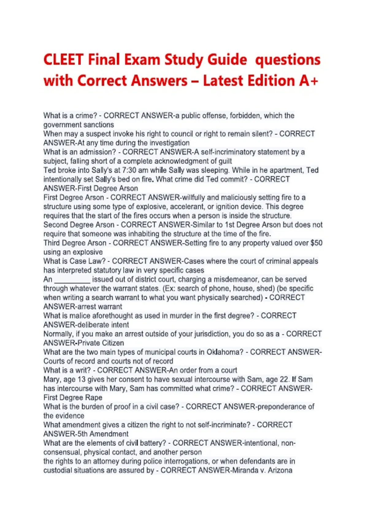 CLEET Final Exam Study Guide questions ...orrect Answers – Latest Edition A+