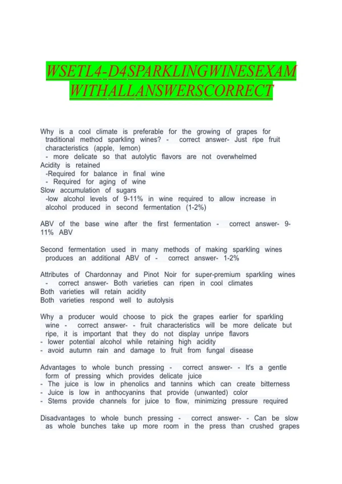 This document contains the WSET Level 4 Diploma D4 Sparkling Wines exam with all answers correct. It is structured in line with the official WSET L4 D4 assessment format, covering essential topics such as sparkling wine production methods, key regions, styles, quality factors, labeling, and market influences. The answers are accurate, clear, and exam-focused, making this resource ideal for revision, mock exams, practice tests, and final exam preparation. Suitable for students preparing for the WSET Level 4 Diploma in Wines, this material supports confident understanding and strong exam performance.