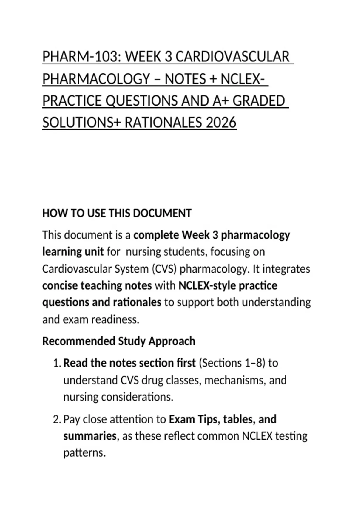 PHARM-103: WEEK 3 CARDIOVASCULAR PHARMACOLOGY – NOTES + NCLEX- PRACTICE QUESTIONS AND A+ GRADED SOLUTIONS+ RATIONALES 2026