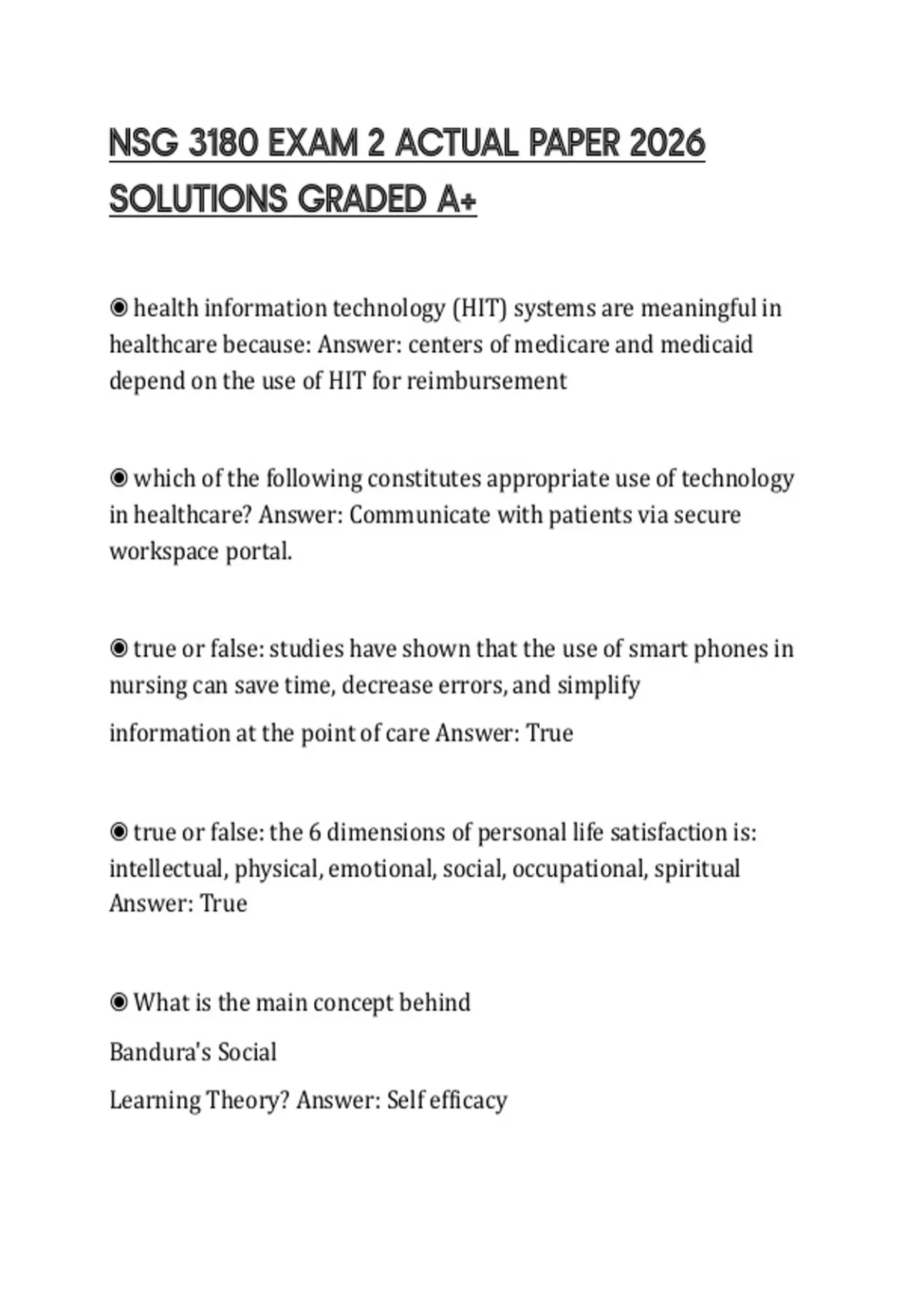 NSG 3180 EXAM 2 ACTUAL PAPER 2026 SOLUTIONS GRADED A+