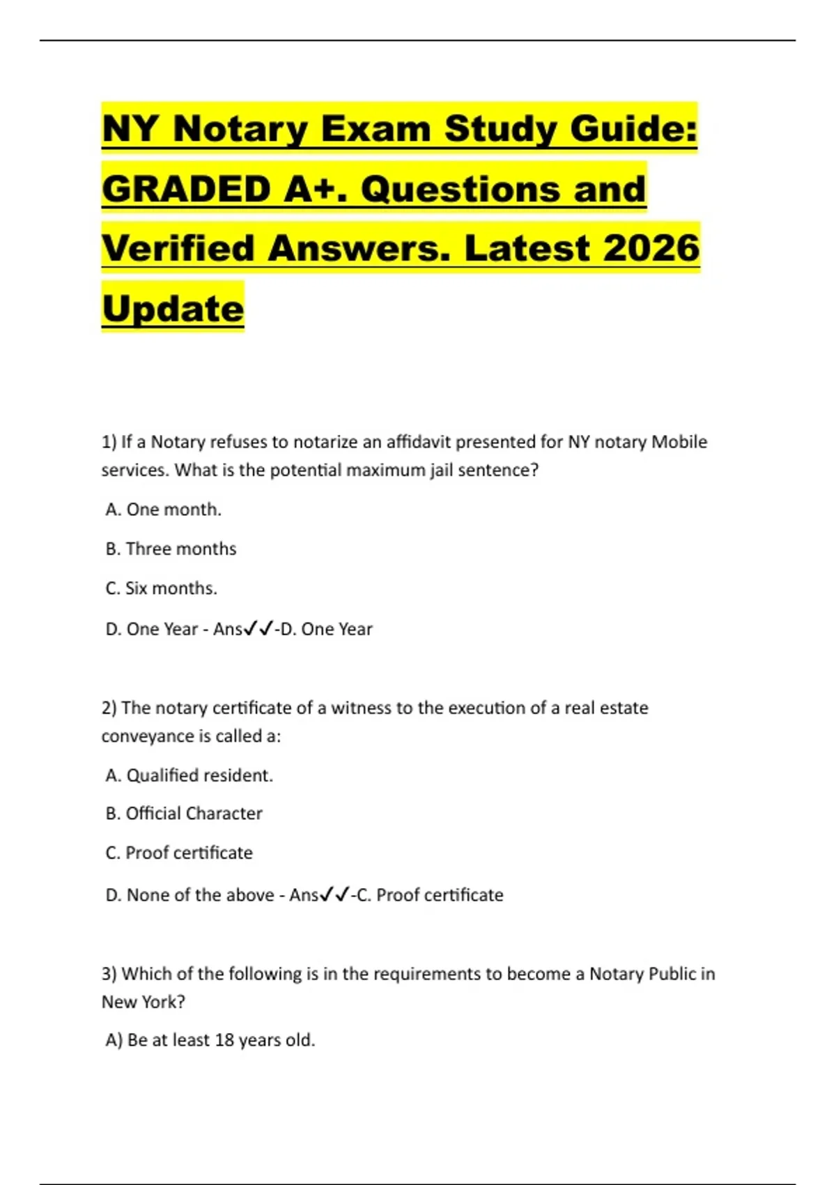 NY Notary Exam Study Guide: GRADED A+. Questions and Verified Answers. Latest 2026 Update NY Notary Exam Study Guide: GRADED A+. Questions and Verified Answers. Latest 2026 Update NY Notary Exam Study Guide: GRADED A+. Questions and Verified Answers. Latest 2026 Update