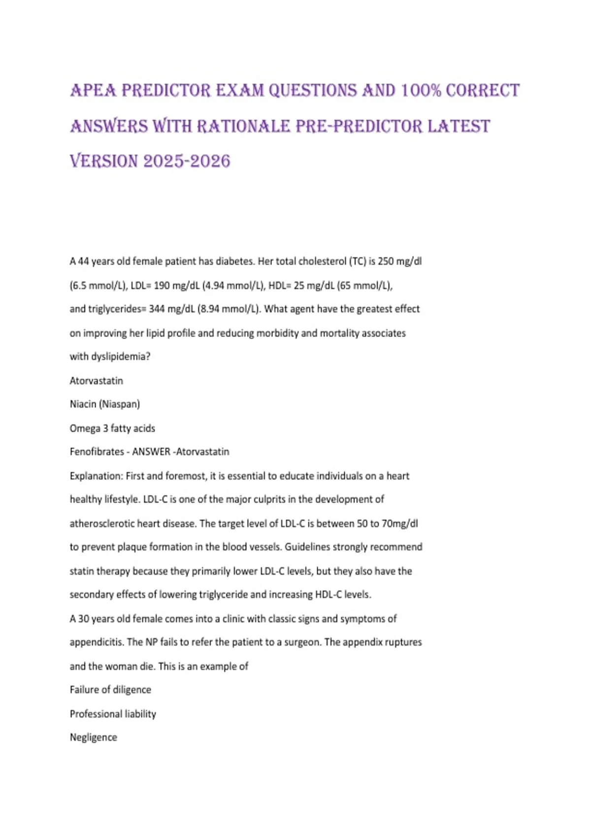 APEA Predictor Exam Questions and 100% Correct Answers with Rationale Pre-Predictor LATEST VERSION A 44 years old female patient has diabetes. Her total cholesterol (TC) is 250 mg/dl (6.5 mmol/L), LDL= 190 mg/dL (4.94 mmol/L), HDL= 25 mg/dL (65 mmol/L), and triglycerides= 344 mg/dL (8.94 mmol/L). What agent have the greatest effect on improving her lipid profile and reducing morbidity and mortality associates with dyslipidemia? Atorvastatin Niacin (Niaspan) Omega 3 fatty acids Fenofibrates - ANSWER -Atorvastatin Explanation: First and foremost, it is essential to educate individuals on a heart healthy lifestyle. LDL-C is one of the major culprits in the development of atherosclerotic heart disease. The target level of LDL-C is between 50 to 70mg/dl to prevent plaque formation in the blood vessels. Guidelines strongly recommend statin therapy because they primarily lower LDL-C levels, but they also have the secondary effects of lowering triglyceride and increasing HDL-C levels. A 30 years old female comes into a clinic with classic signs and symptoms of appendicitis. The NP fails to refer the patient to a surgeon. The appendix ruptures and the woman die. This is an example of Failure of diligence Professional liability Negligence Malpractice - ANSWER -Malpractice Explanation: malpractice, a negligence tort, occurs when a health care professional's actions fall bellow the appropriate standard of care and hurts the patient. In this case the patient came with sings and symptoms indicating appendicitis and the NP failed to refer the patient. A NP has recently been hired to work in a fast track facility. The NP employer asked if she has "a problem prescribing medications for emergency contraception." The NP replies affirmatively. This is: a. Grounds for dismissal An ethical dilemma for the NP Illegal according to the standards of nursing Patient abandonment. - ANSWER -An ethical dilemma for the NP Explanation: in this instance, the NP has a difference of opinion with her employer based on her religious or moral belief about providing emergency contraception. This situation is an example of an ethical dilemma. Failure to participate in the provision of care to the patient based on the NP's beliefs is neither against the law nor a violation of the standards of practice A patient presents with pruritic lesions on both knees. There are visible silver scales. How Should this condition be managed? . Topical antifungal cream or ointment Oral antibiotics Topical corticosteroids cream . Topical anti-fungal/ steroid cream - ANSWER -Topical corticosteroids cream Explanation: Psoriasis is characterized by erythematous papules, as well as itchy, red, precisely defined plaques with silvery scales. Auspitz sings is another common finding. Topical agents containing tar and salicylic acid may be used. Topical steroids, such as betamethasone, may also be ordered. Antidepressant discontinuation syndrome is less likely if the patient Is male Is less than 35 y/o Has taken an SSRI with a short half life Gradually tapers SSRI use - ANSWER -Gradually tapers SSRI use Explanation: Antidepressant discontinuation syndrome is most often seen in the primary care office in association with SSRI discontinuation, because SSRIs are the most commonly prescribed class of antidepressant medications. Interruption of treatment with an anti-depressant medication is sometimes associated with an antidepressant discontinuation syndrome; in early reports it was referred to as a "withdrawal reaction. Symptoms of antidepressant discontinuation syndrome can include flu-like symptoms, insomnia, nausea, imbalance, sensory disturbances, and hyperarousal. Tapering is recommended by experts. Patient with benign prostatic hyperplasia (BPH) should be taught to avoid which one of the following drug classes? . Alpha adrenergic antagonist Anti-androgen agents Tricyclic antidepressant (TCA) Sulfonamides - ANSWER -Tricyclic antidepressant (TCA) Explanation: tricyclic antidepressant should not be used by men with benign prostatic hyperplasia because of the increased risk of urinary retention secondary to the anticholigergic effects of TCAs. Which of the following is the best response to a woman who has just admitted she is a victim of spousal abuse? What was it that you did to make him angry? You must seek refuge immediately I am concerned about your safety I am going to call a shelter for you - ANSWER -I am concerned about your safety Explanation: The first step is to establish trust in the therapeutic relationship. without trust future collaboration, intervention and client outcome cannot be accomplished to facilitate appropriate and safe behavior. The experience of abuse is a traumatic psychological crisis that must be addressed as such. The healthcare