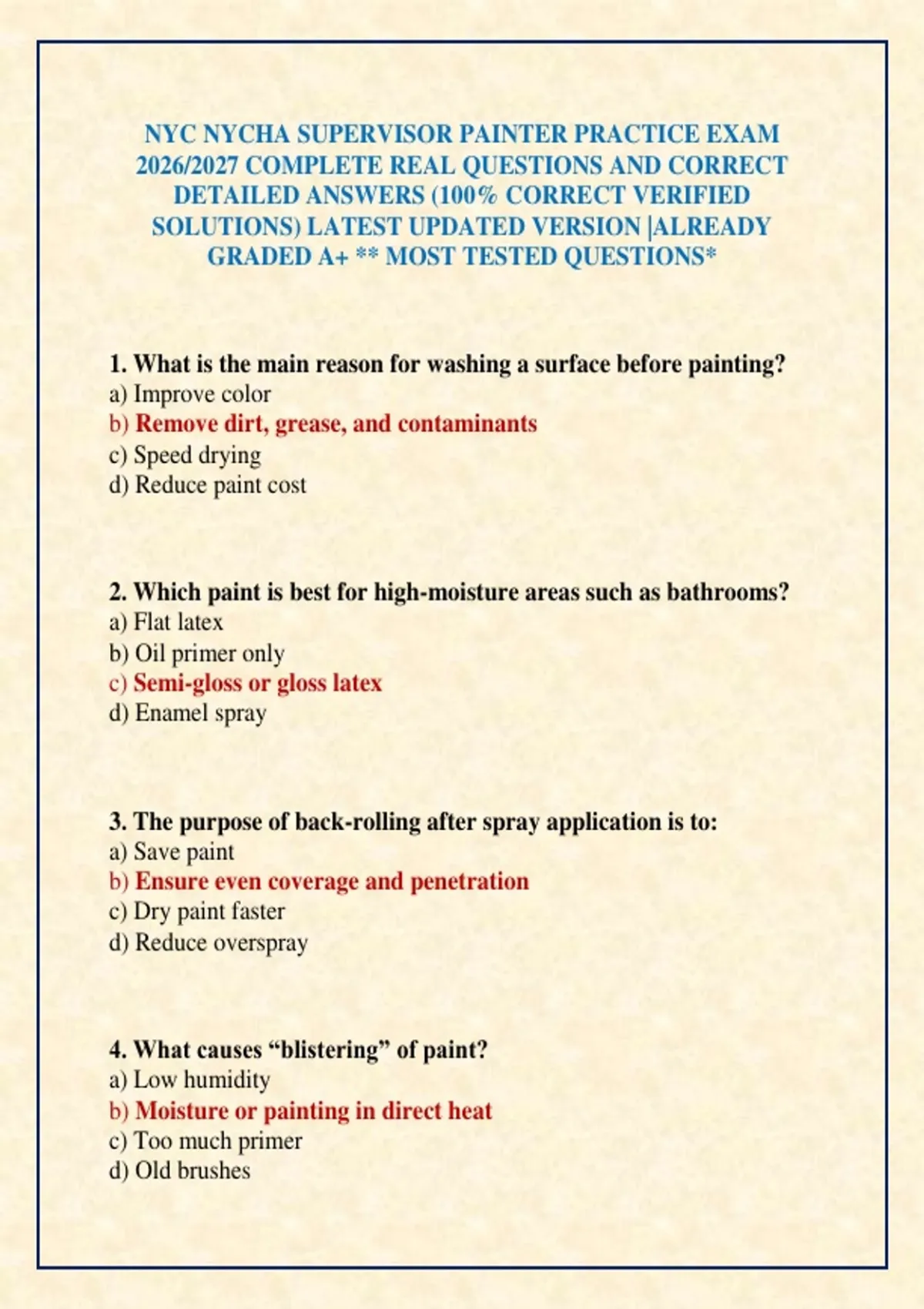 NYC NYCHA SUPERVISOR PAINTER PRACTICE EXAM 2026/2027 COMPLETE REAL QUESTIONS AND CORRECT DETAILED ANSWERS (100% CORRECT VERIFIED SOLUTIONS) LATEST UPDATED VERSION |ALREADY GRADED A+ ** MOST TESTED QUESTIONS*