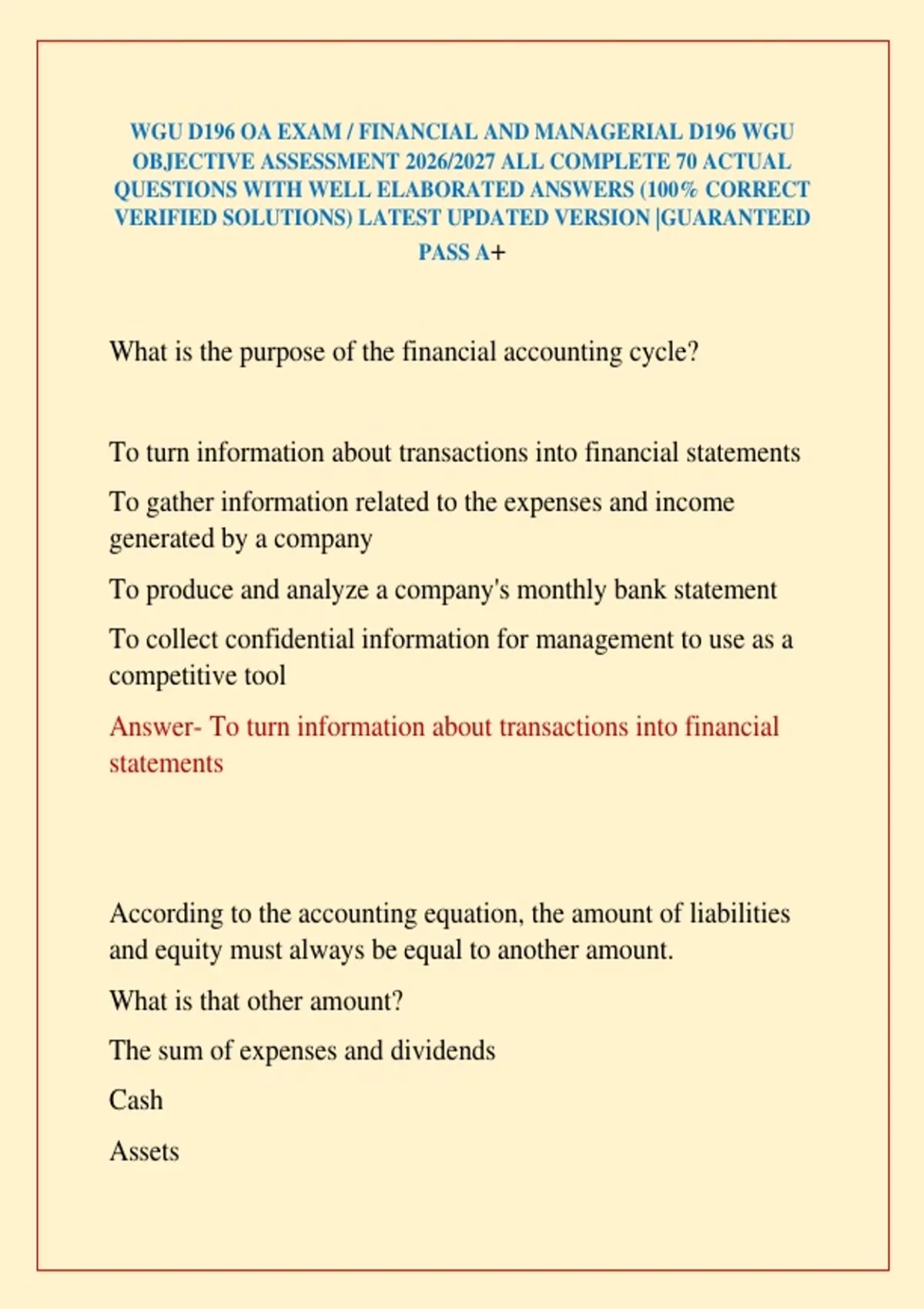WGU D196 OA EXAM / FINANCIAL AND MANAGERIAL D196 WGU OBJECTIVE ASSESSMENT 2026/2027 ALL COMPLETE 70 ACTUAL QUESTIONS WITH WELL ELABORATED ANSWERS (100% CORRECT VERIFIED SOLUTIONS) LATEST UPDATED VERSION |GUARANTEED PASS A+
