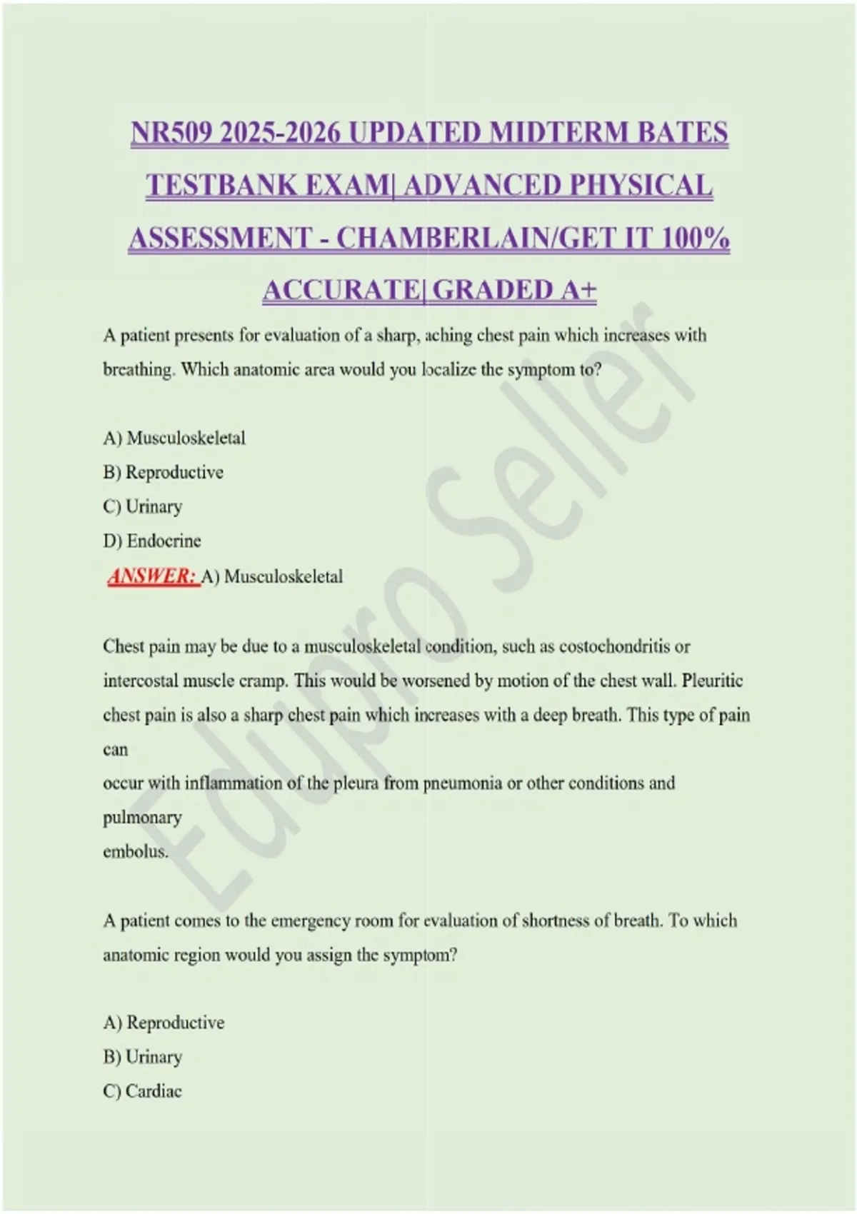 NR UPDATED MIDTERM BATES TESTBANK EXAM| ADVANCED PHYSICAL ASSESSMENT - CHAMBERLAIN/GET IT 100% ACCURATE| GRADED A+